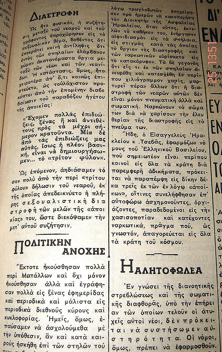 Σε άλλα άρθρα της ίδιας χρονιάς, η εφημερίδα επιτίθεται κατά των απανταχού χίπιδων, γράφει για τους «ανεγκέφαλους» που κυλιούνται σε λάσπες, θεωρεί το φεστιβάλ του Γούντστοκ «μεγάλο κατάντημα», και άλλα τέτοια γραφικά και ανυπόστατα που μπορούσαν να προκαλέσουν όμως –στους φιλόξενους κρητικούς που αγαπούσαν τους χίπιδες- την αίσθηση ενός κινδύνου. Είναι φανερό ότι η εφημερίδα θέλει να τρομοκρατήσει τους γονείς, υποβάλλοντάς τους την ιδέα, πως τα παιδιά τους κινδυνεύουν να γίνουν ομοφυλόφιλοι.