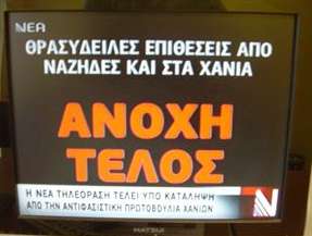 Mέλη της “Αντιφασιστικής Πρωτοβουλίας Χανίων” πραγματοποίησαν κατάληψη στη ΝΕΑ τηλεόραση στα Χανιά κατά τη διάρκεια του μεσημεριανού δελτίου ειδήσεων στις 3:00 και μετέδωσαν βίντεο με αντιφασιστικά μηνύματα, με αφορμή την επίσκεψη των βουλευτών της Χρυσής Αυγής Ηλία Κασιδιάρη, Χρήστο Παππά, Νίκο Μίχο και Κώστα Μπαρμπαρούση.