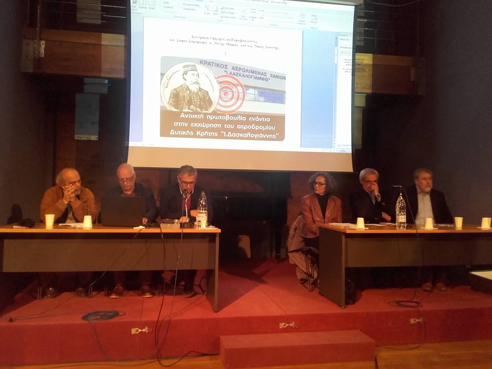 Η εκδήλωση άνοιξε με ομιλία του καθηγητή του ΑΠΘ και ενεργού μέλους της Ανοικτής Πρωτοβουλίας Πολιτών κ. Αντώνη Σκαμνάκη ο οποίος ζήτησε από τους πολίτες να συστρατευθούν στον αγώνα για την αποτροπή της εκποίησης του αεροδρομίου Χανίων. Να υπενθυμίσουμε ότι η Fraport αναλαμβάνει τη διαχείριση των 14 περιφερειακών αεροδρομίων στις 15 Μαρτίου.