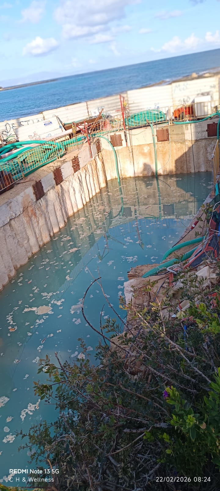 Ο Σύλλογος επισημαίνει ότι στάσιμο νερό που παρέμενε στον λάκκο εκσκαφής από τις 20 Φεβρουαρίου διοχετεύθηκε στις 3 Μαρτίου — δέκα ημέρες αργότερα — στην ακτή και τη θάλασσα. Παράλληλα, αναφέρεται ότι στην ακτή παρατηρείται εδώ και ημέρες παρουσία τσιμεντοειδών καταλοίπων, ενώ παραμένει άγνωστο τι άλλου είδους οικοδομικά υλικά καταλήγουν στον λάκκο εκσκαφής και διοχετεύονται στη θάλασσα.