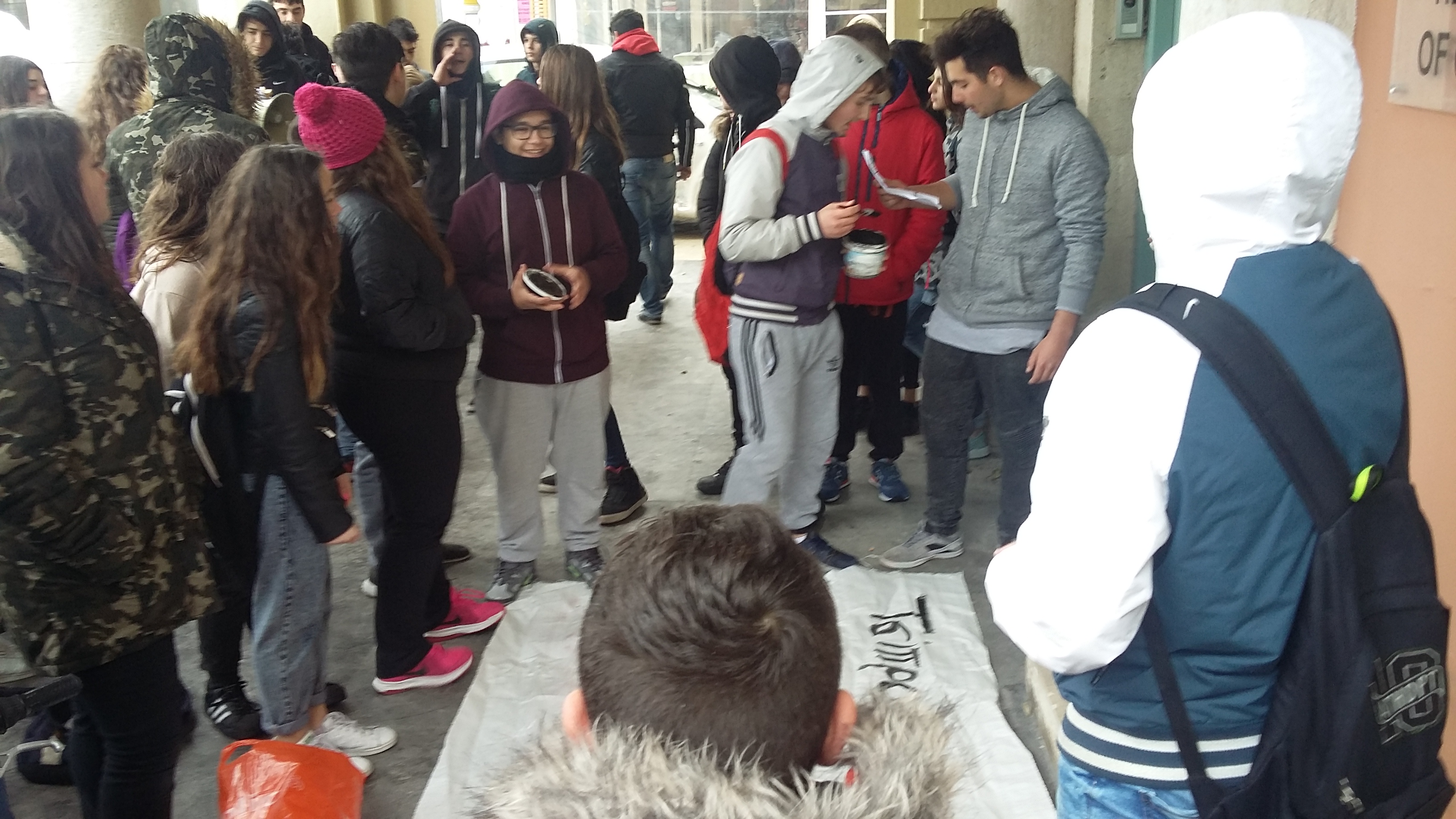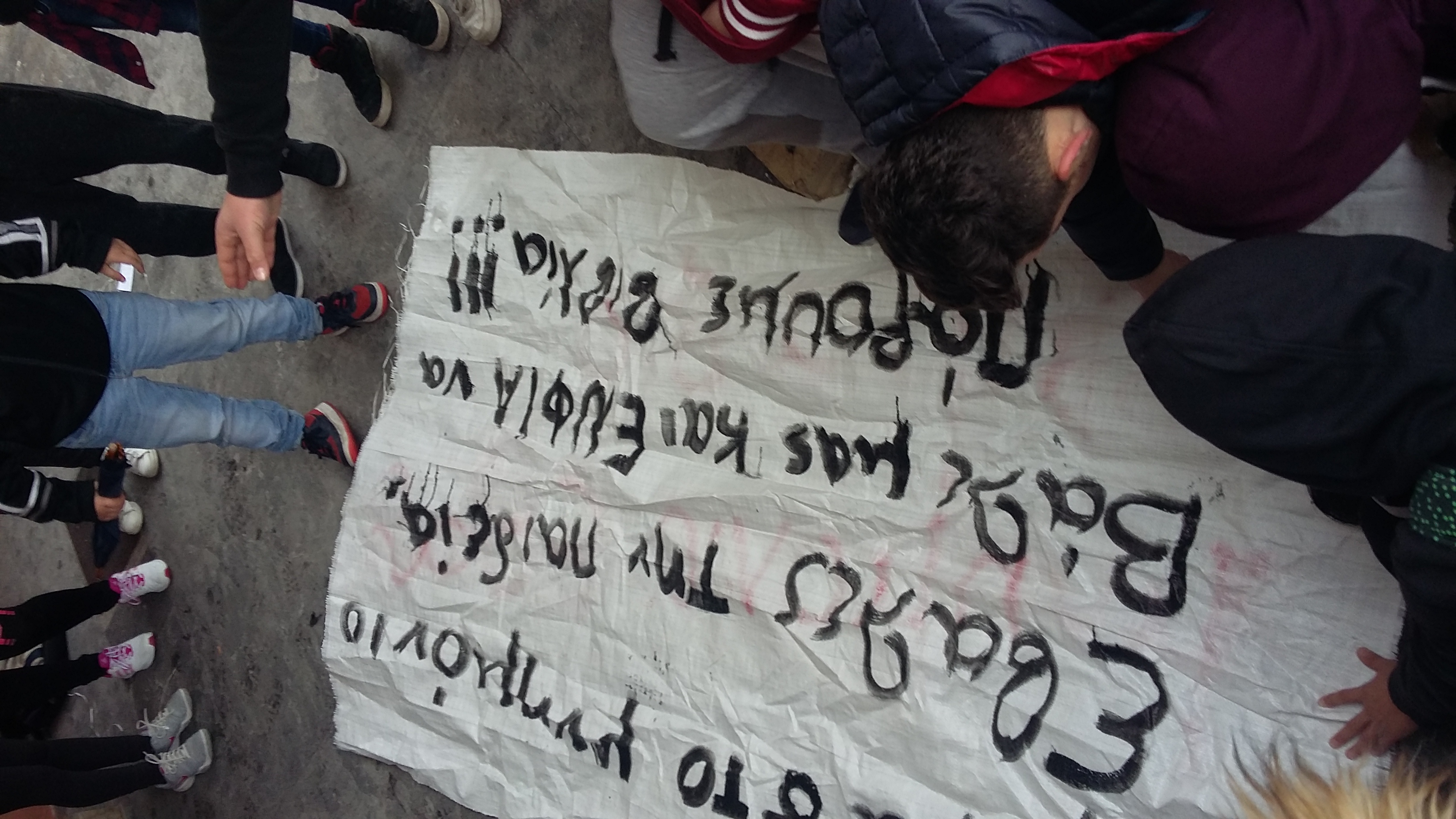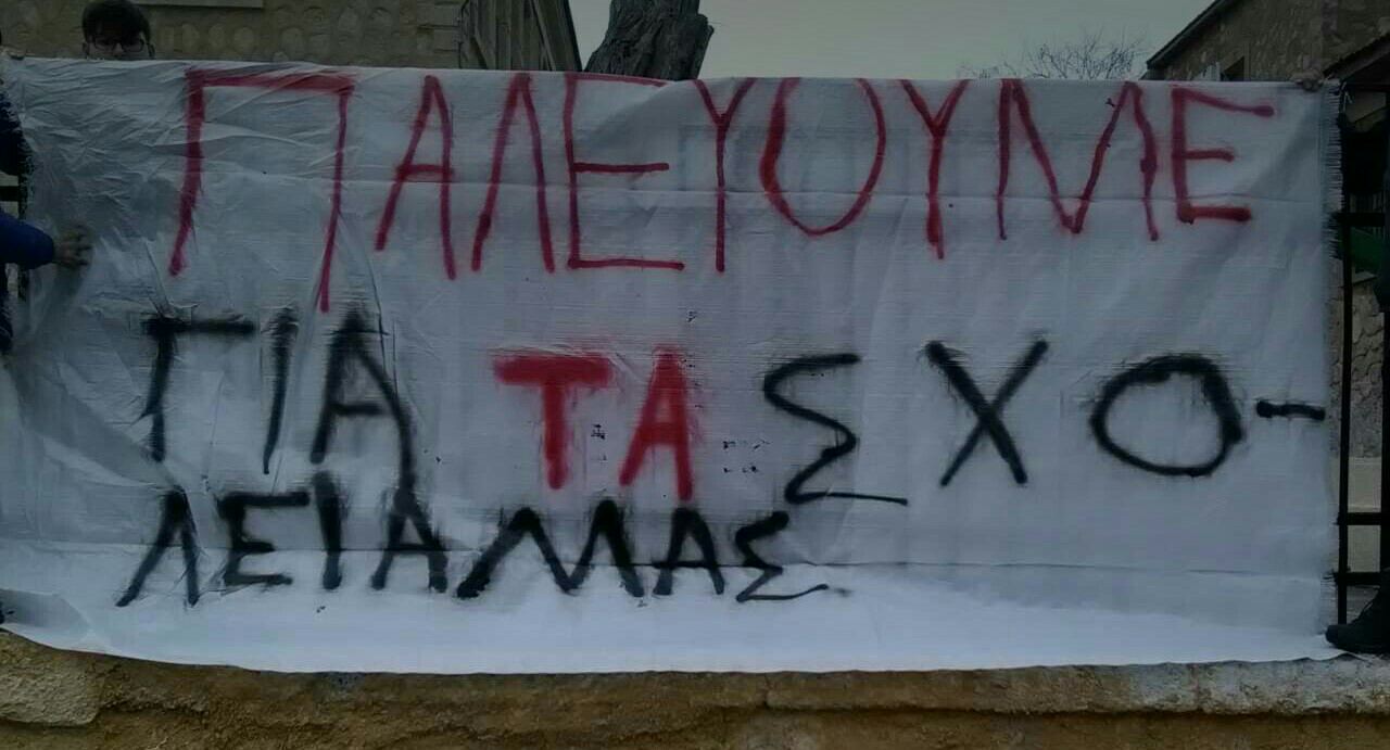 Οι μαθητές δεν μπορούμε να να μείνουμε θεατές απέναντι στην κυβέρνηση και στην ΕΕ, που στραγγαλίζει τις οικογένειες μας ,οι οποίες δίνουν ένα σωρό λεφτά σε χαράτσια, ΕΝΦΙΑ και πρόσθετους φόρους. Τα λεφτά αυτά δεν πάνε ούτε στα σχολεία ούτε στα νοσοκομεία αλλά στις τσέπες των βιομηχάνων, των εφοπλιστών και των τραπεζιτών