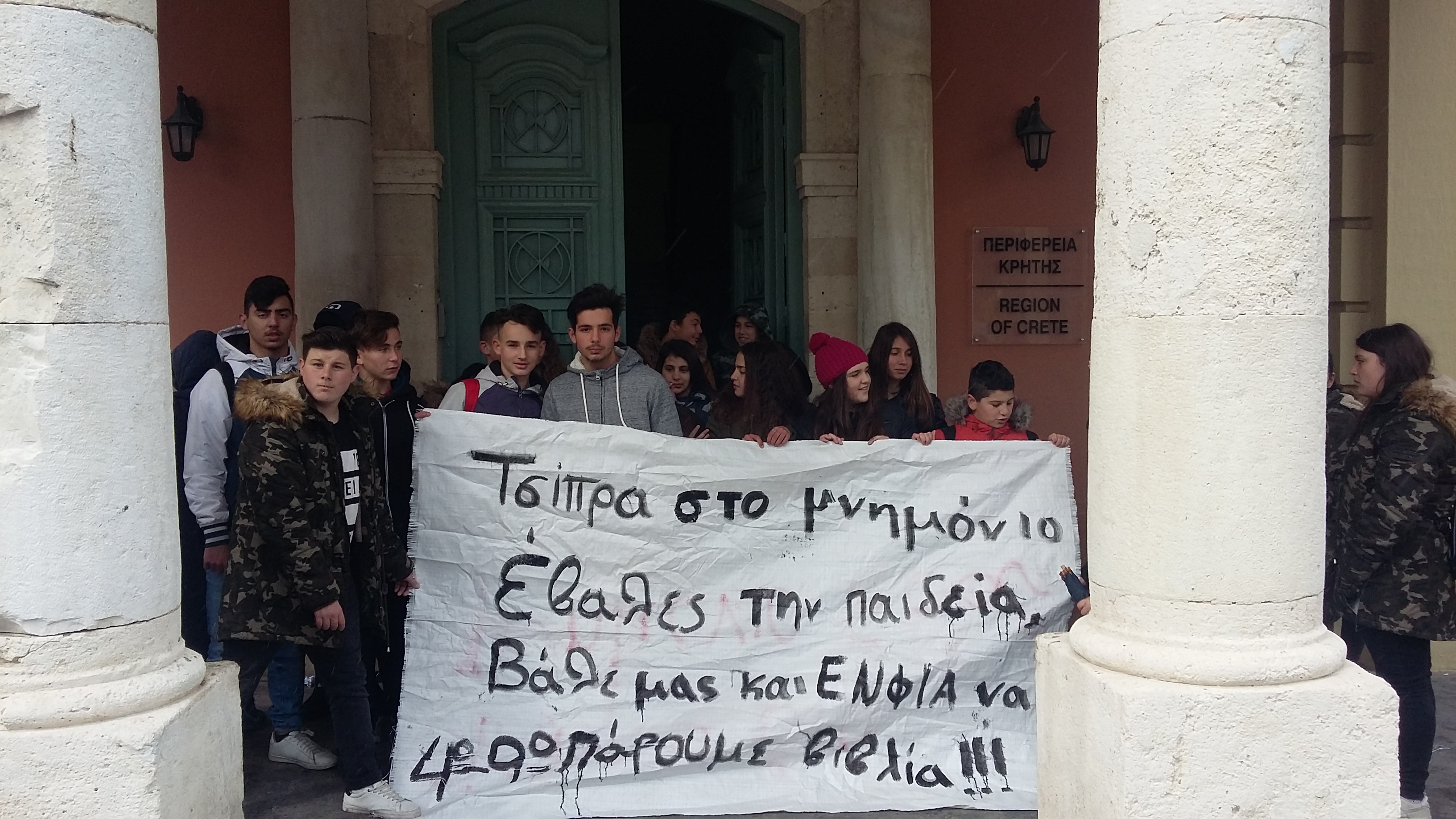 Κινητοποιήσεις μαθητών πραγματοποιήθηκαν και στην Κρήτη σήμερα Δευτέρα 13/2 σε συντονισμό με μαθητές από όλη την Ελλάδα. Στο Ηράκλειο Κρήτης κινητοποιήθηκαν συντονισμένα μαθητές από το 9ο και 4ο Γυμνάσιο και διαδήλωσαν για ένα σχολείο που θα μορφώνει και δεν θα εξοντώνει. Στην περιφέρεια Κρήτης πραγματοποιήθηκε συγκέντρωση όπου οι μαθητές σήκωσαν πανό με σύνθημα ενάντια στην κυβέρνηση και την πολιτική που ακολουθεί και στον χώρο της Παιδείας. Τα συνθήματα που κυριάρχησαν ήταν “η Νέα γενιά έχει ιδανικά,ούτε ξεπουλιέται,ούτε προσκυνά”. “Τσίπρα στο μνημόνιο έβαλες την Παιδεία ,βάλε μας και ΕΝΦΙΑ να πάρουμε βιβλία”.