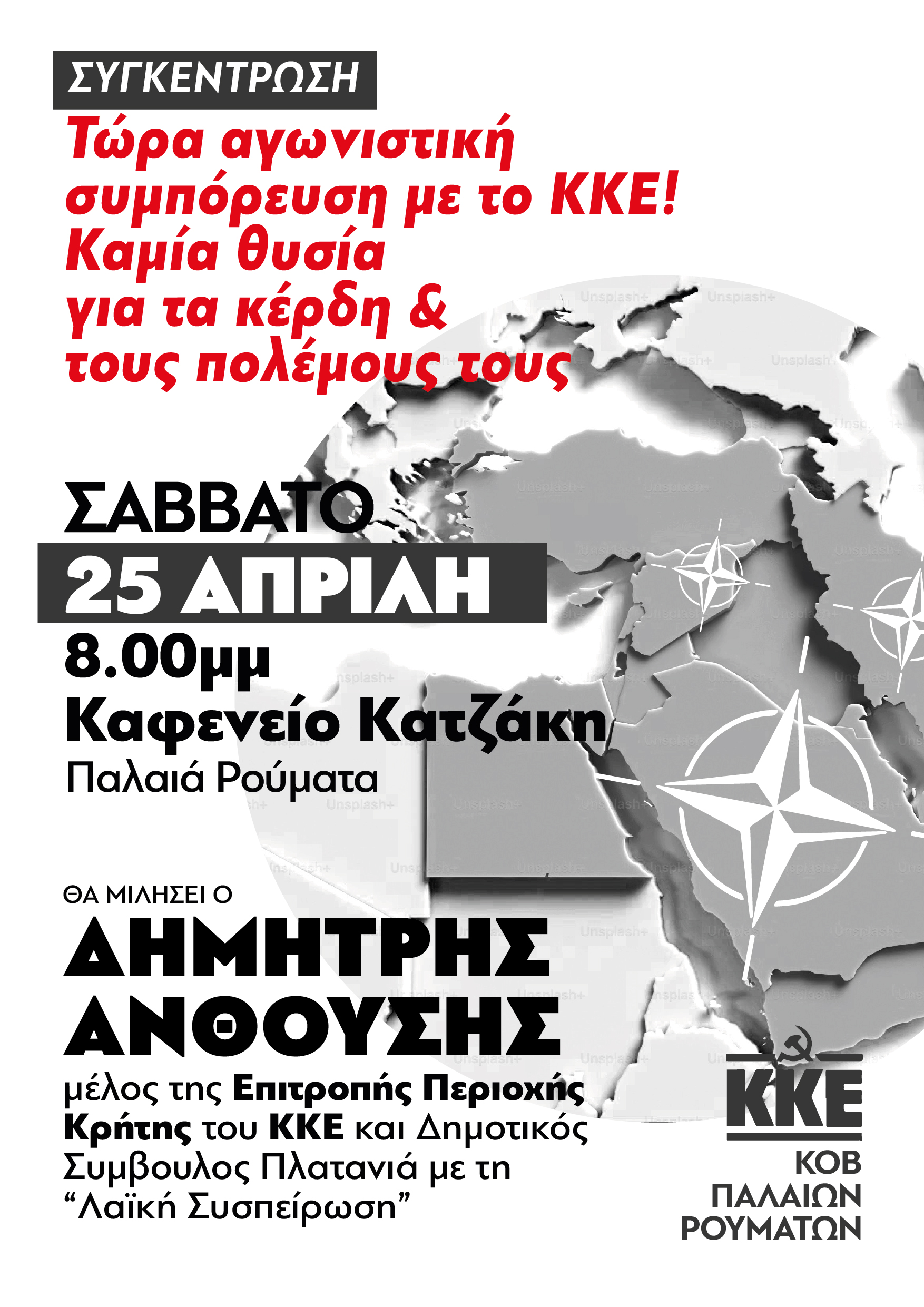 Ομιλητής στην εκδήλωση των Παλαιών Ρουμάτων θα είναι ο Δημήτρης Ανθούσης, μέλος της Επιτροπής Περιοχής Κρήτης του ΚΚΕ και δημοτικός σύμβουλος Πλατανιά με τη «Λαϊκή Συσπείρωση».