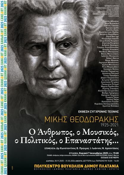 Με μια ιδιαίτερη εκδήλωση κλείνει το Σάββατο 4 Απριλίου 2026 στις 20:00 η έκθεση σύγχρονης τέχνης «Μίκης Θεοδωράκης (1925–2021): Ο Άνθρωπος, ο Μουσικός, ο Πολιτικός, ο Επαναστάτης…» στο Πολύκεντρο Βουκολιών του Δήμου Πλατανιά, που συνδιοργανώθηκε με αφορμή τη συμπλήρωση 100 ετών από τη γέννηση του σπουδαίου δημιουργού.