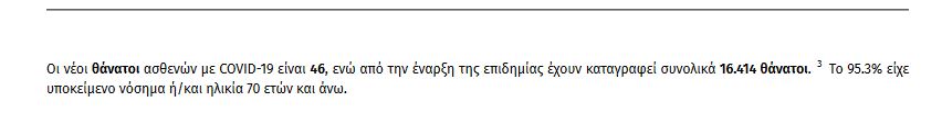 Συγκεκριμένα, όσον αφορά τους νεκρούς, σήμερα καταγράφεται πως συνολικά από την αρχή της πανδημίας έχουμε 16.414 θανάτους. Χθες, ο αριθμός ήταν 16.361. Με μια απλή αφαίρεση (16.414- 16.361 = 53) προκύπτει πως σήμερα ο αριθμός των θανάτων είναι 53 και όχι 46.