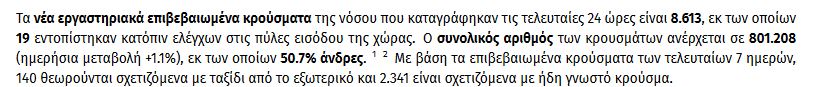 Επίσης, όσον αφορά τα κρούσματα, σήμερα καταγράφεται πως συνολικά από την αρχή της πανδημίας είναι 801.208. Χθες, ο αριθμός ήταν 792.239. Με μια απλή αφαίρεση (801.208 – 792.239 = 8969) προκύπτει πως είναι 8969 και όχι 8.613.