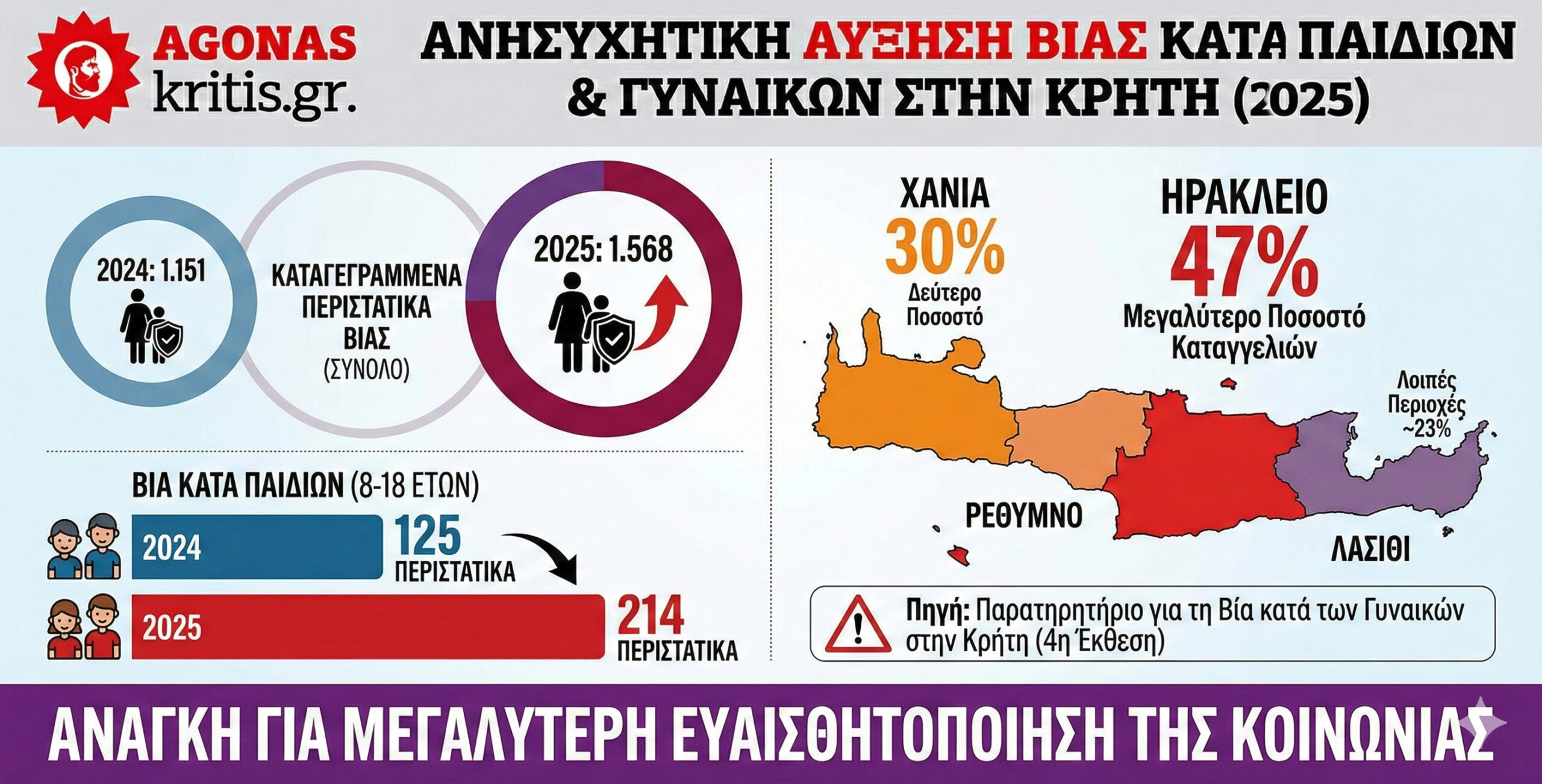 Ανησυχητική αύξηση των περιστατικών βίας κατά παιδιών και γυναικών καταγράφεται στην Κρήτη το 2025, προκαλώντας την ανάγκη για μεγαλύτερη ευαισθητοποίηση της κοινωνίας. Τα στοιχεία είναι αμείλικτα και αποτυπώνουν τη διόγκωση του φαινομένου που έχει διάφορες αιτίες. Ειδικότερα σύμφωνα με την τέταρτη έκθεση του Παρατηρητηρίου για τη Βία κατά των Γυναικών στην Κρήτη, τα καταγεγραμμένα περιστατικά βίας το 2024 στο νησί ανήλθαν σε 1.151, ενώ ήδη φέτος έχουν φθάσει στα 1.568.