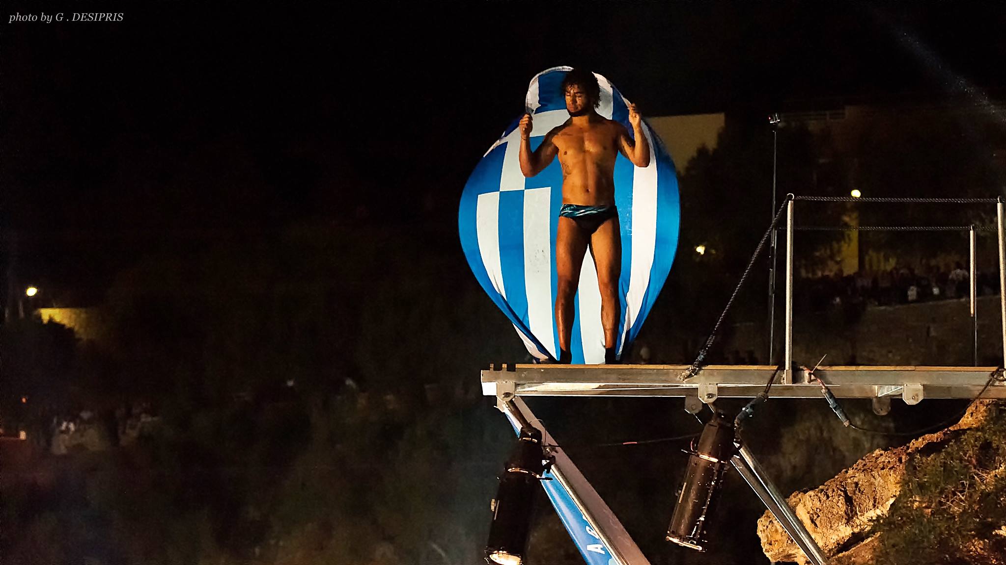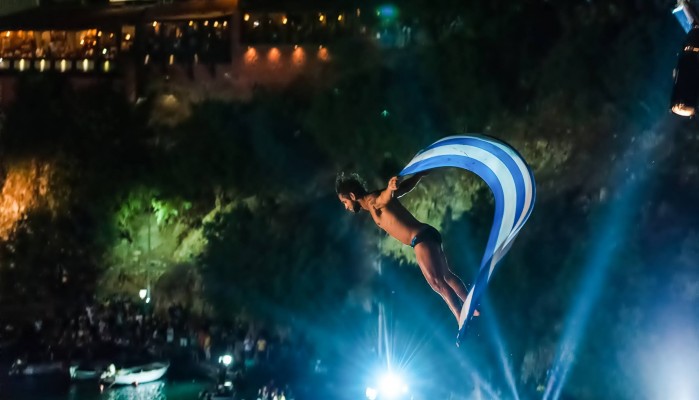 Ο 25χρονος Lazo Schaller -ένας από τους 9 καταδύτες που συμμετείχαν στο διήμερο Agios Nikolaos Cliff Diving show- προκάλεσε το ενθουσιώδες χειροκρότημα του κοινού, κάνοντας βουτιές με την ελληνική σημαία.