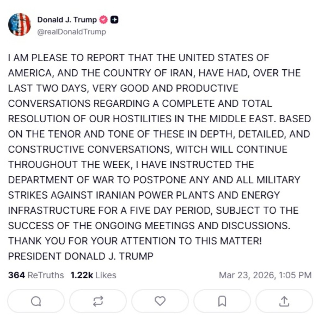 «Είμαι στην ευχάριστη θέση να αναφέρω ότι οι Ηνωμένες Πολιτείες της Αμερικής και η χώρα του Ιράν είχαν, τις τελευταίες δύο ημέρες, πολύ καλές και παραγωγικές συνομιλίες σχετικά με μια πλήρη και ολική επίλυση των εχθροπραξιών μας στη Μέση Ανατολή. Με βάση το περιεχόμενο και το ύφος αυτών των εις βάθος, λεπτομερών και εποικοδομητικών συνομιλιών, οι οποίες θα συνεχιστούν καθ’ όλη τη διάρκεια της εβδομάδας, έχω δώσει εντολή στο Υπουργείο Πολέμου να αναβάλει οποιεσδήποτε στρατιωτικές επιθέσεις κατά ιρανικών σταθμών παραγωγής ενέργειας και ενεργειακών υποδομών για περίοδο πέντε ημερών, υπό την προϋπόθεση της επιτυχίας των συνεχιζόμενων συναντήσεων και συζητήσεων. Σας ευχαριστώ για την προσοχή σας σε αυτό το ζήτημα!», έγραψε αναλυτικά ο πρόεδρος των ΗΠΑ.