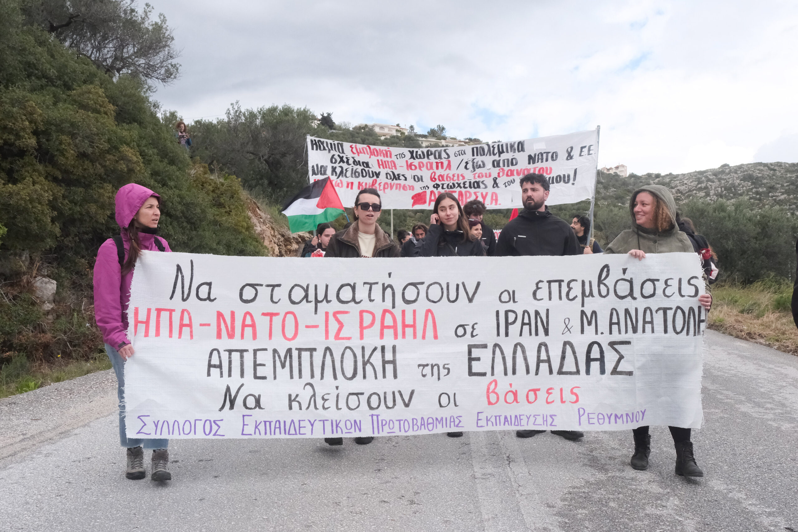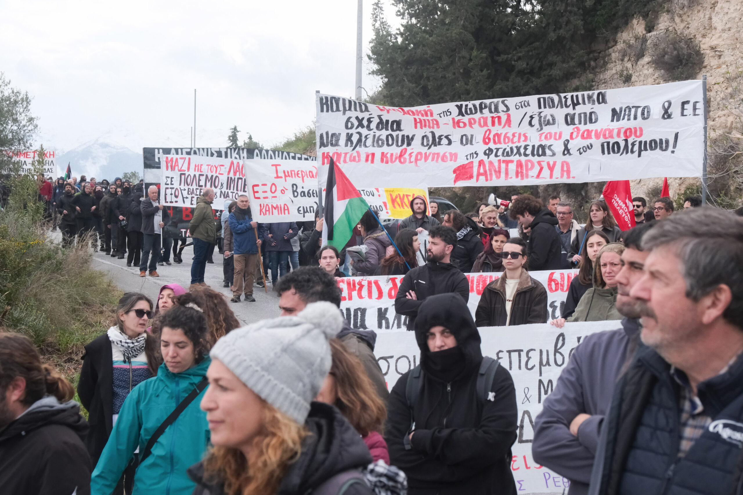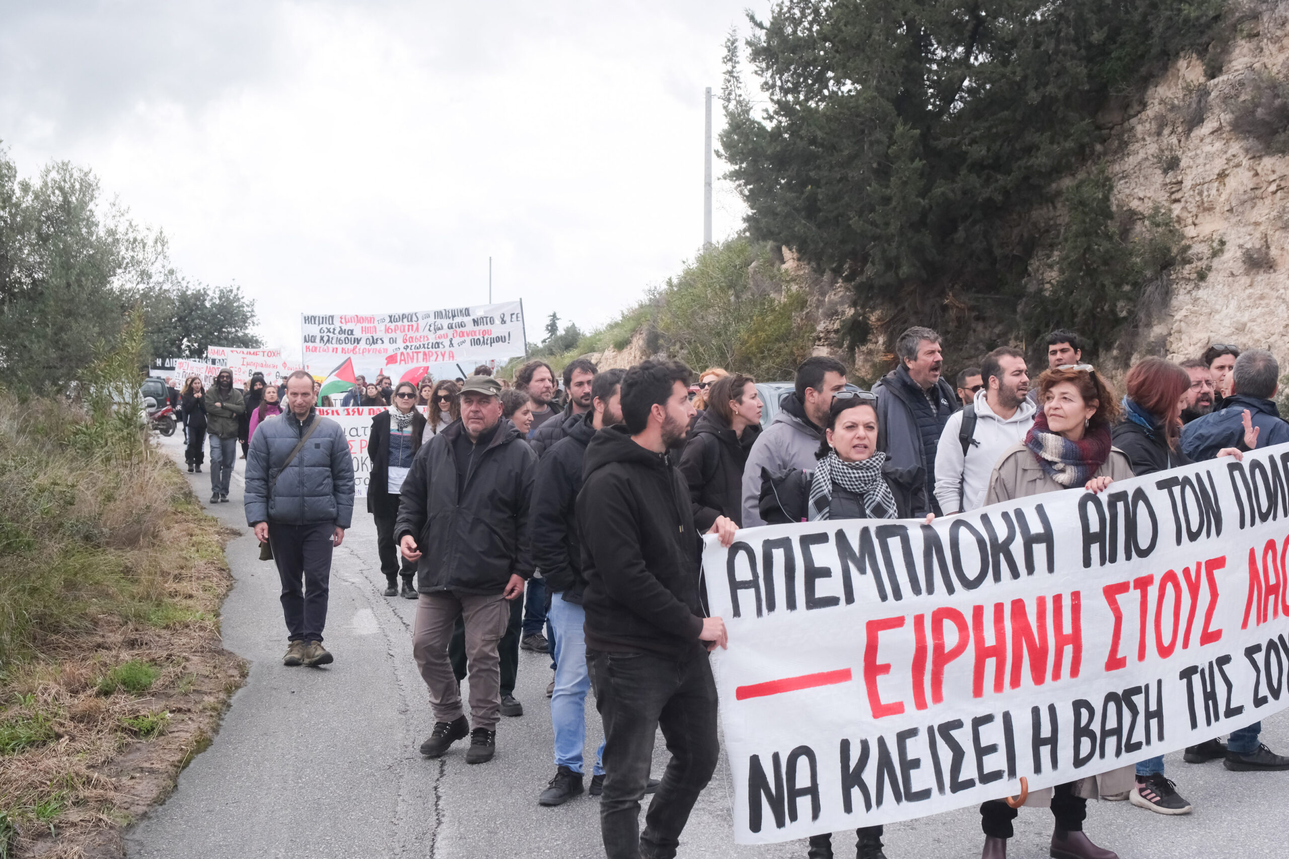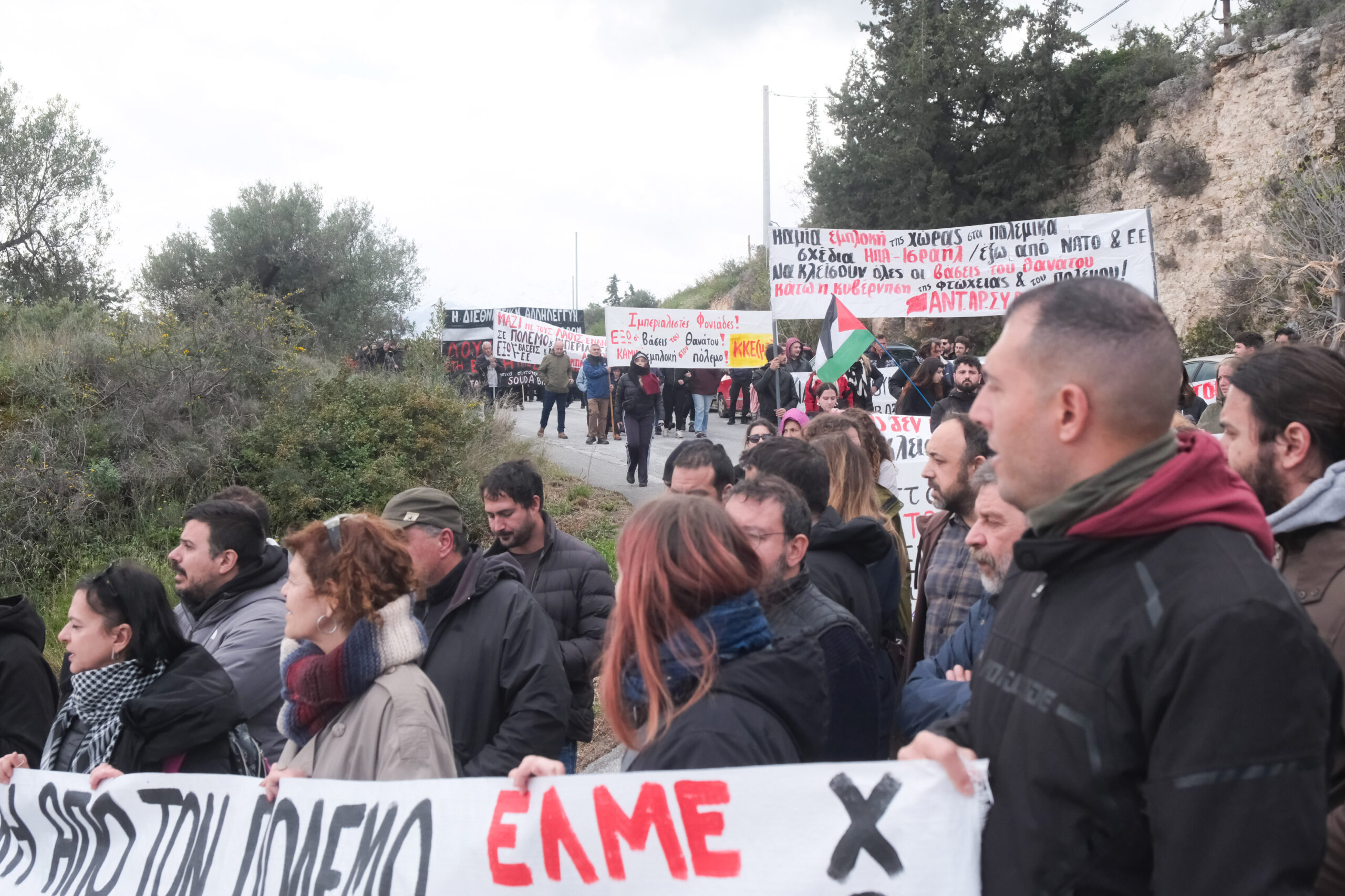 Διαδηλωτές από όλη την Κρήτη αλλά και εκπρόσωποι φορέων και συλλογικοτήτων συμμετείχαν στην πορεία στη βάση η οποία όμως δεν έφτασε μέχρι την πύλη αφού ισχυρές αστυνομικές δυνάμεις βρισκόταν σε σημείο που απόκλειε την όποια πρόσβαση.