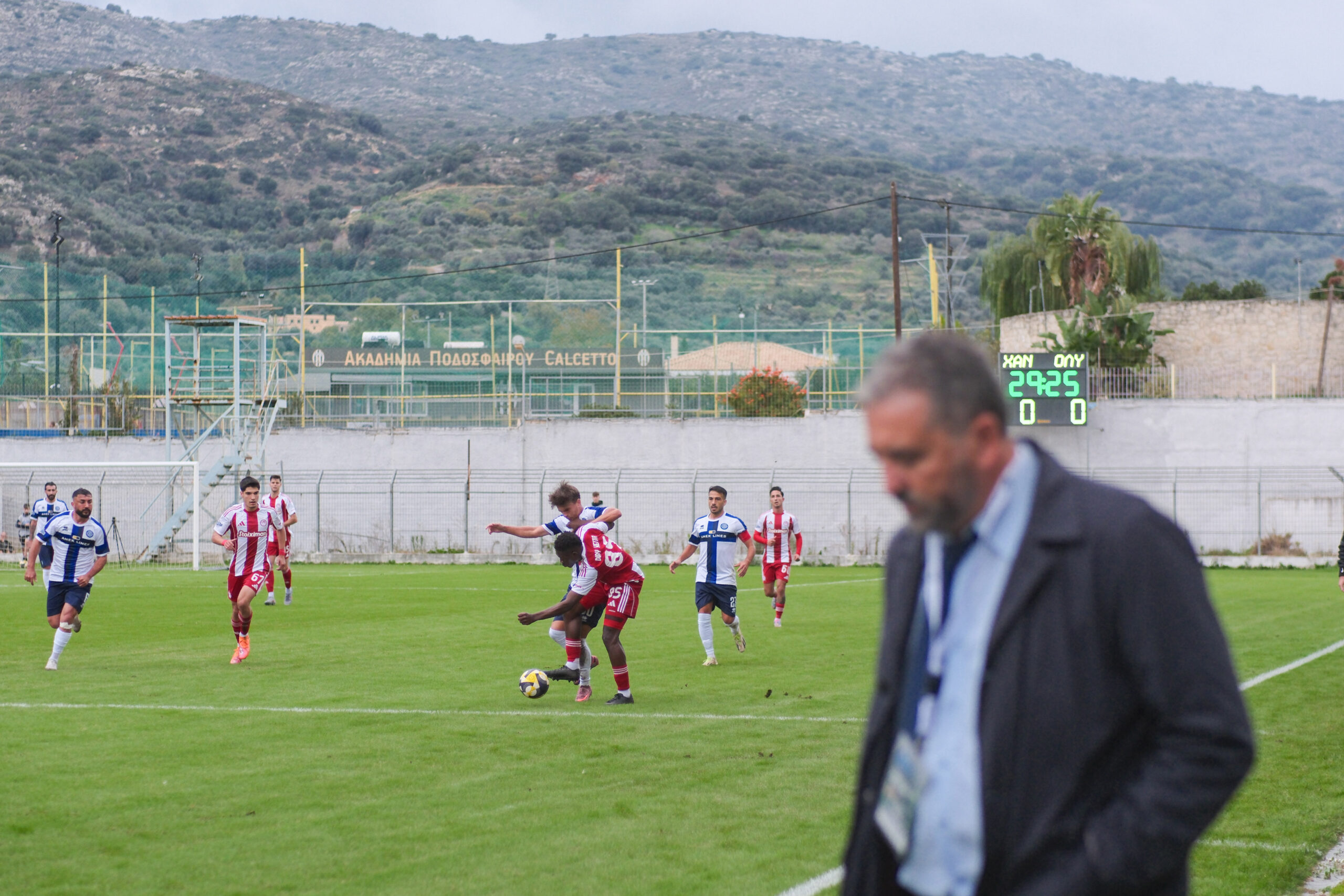 Το παιχνίδι, που σε γενικές γραμμές κυμάνθηκε σε ρηχά νερά από πλευράς ρυθμού, βρήκε τα Χανιά να απειλούν νωρίς, μόλις στο 6ο λεπτό. Ο Ολυμπιακός Β’ ισορρόπησε σταδιακά, καταγράφοντας την πρώτη του αξιόλογη στιγμή στο 18′ με σουτ του Κεϊτά που εξουδετέρωσε ο Στογιάκοβιτς. Οι φιλοξενούμενοι είχαν καλές στιγμές και στη συνέχεια, με τον Έξαρχο να μπλοκάρει μακρινό σουτ του Ράδου στο 23′ και τον Κουτσογούλα να αστοχεί από πλεονεκτική θέση στο 33′.