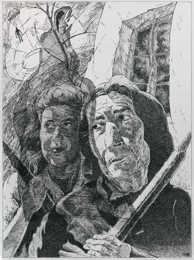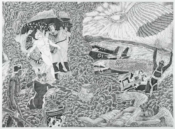 Οι γυναίκες της Κρήτης, μάρτυρες της Μάχης – Κλασσικές γυναίκες της Μινωικής περιόδου και μοντέρνες γυναίκες της Κρήτης κοιτάζουν πάνω από το ιστορικής σημασίας λιμάνι της Σούδας κατά τη διάρκεια της μάχης. Τα σύννεφα μαύρου καπνού ανεβαίνουν στον γαλάζιο κρητικό ουρανό από τον βομβαρδισμό των συμμαχικών πλοίων, παραπέμπει στη θρυλική καταστροφή της Κρήτης και του Μινωικού πολιτισμού από τη δραστηριότητα του ηφαιστείου της Θήρας