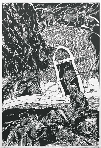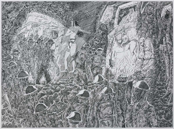 Δύο νεκροί και το ταξίδι του στον ποταμό Στυξ υπό το βλέμμα ενός αρχαίου Κούρου – Στην ελληνική μυθολογία ο ποταμός Στυξ ήταν ένα σταυροδρόμι όπου ο κόσμος των ζωντανών συνδεόταν με τον κόσμο των νεκρών, τον γνωστό ως Άδη. Πίστευαν ότι οι ψυχές των νεκρών, θεών, θνητών, ηρώων και εγκληματιών, όλες μεταφέρονταν δια του ποταμού από τον βαρκάρη Χάροντα. Εδώ, δύο Αυστραλοί στρατιώτες στον ποταμό Στυξ σε μια ξύλινη βάρκα. Από πίσω τους ένας Κούρος ή ένα άγαλμα νεότητας. Αυτά τα στυλιζαρισμένα αγάλματα που απεικόνιζα γυμνούς νέους άντρες θεωρούνται σήμερα ένα από τα πιο ξεχωριστά προϊόντα της αρχαιότητας, της περιόδου μεταξύ 650 έως 500 π.Χ.