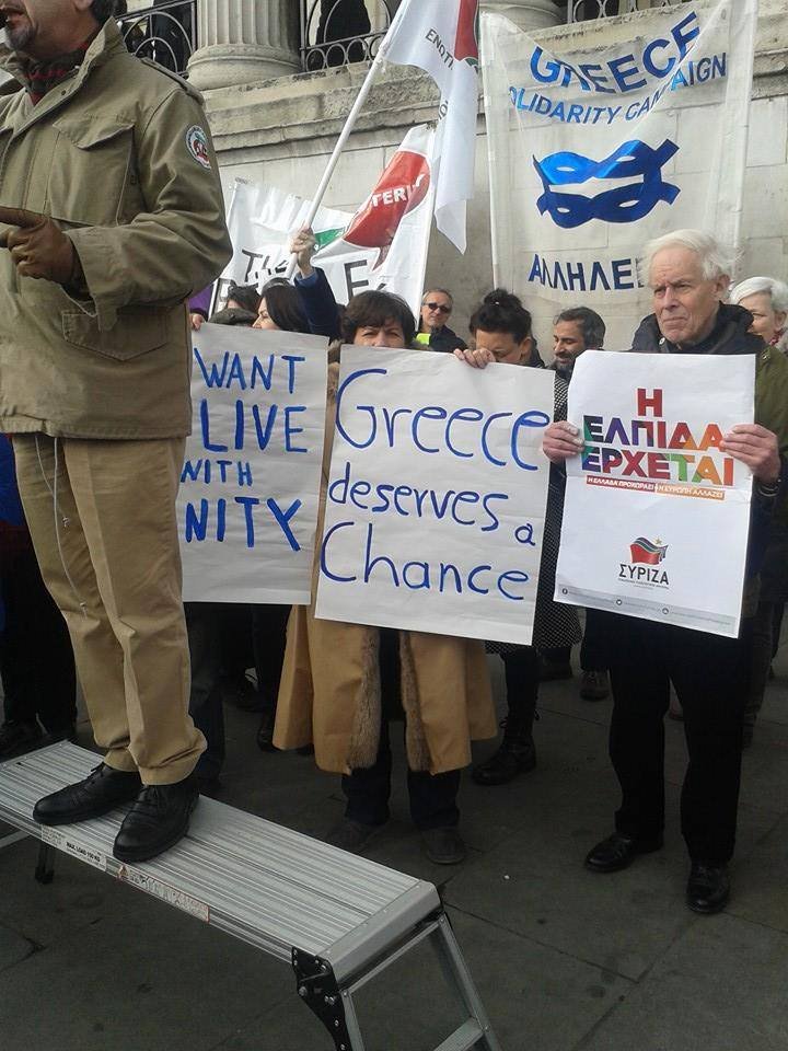 Χθες, στο πλαίσιο των πανευρωπαϊκών και παγκόσμιων κινητοποιήσεων αλληλεγγύης στον αγώνα για να μπει τέλος στη λιτότητα στην Ελλάδα πραγματοποιήθηκε συγκέντρωση στην Πλατεία Τραφάλγκαρ στο Λονδίνο.