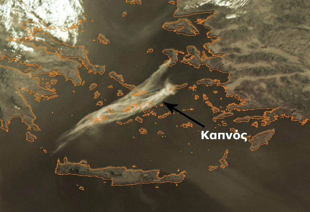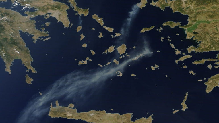 Είναι χαρακτηριστική η φωτογραφία από τον δορυφόρο της NASA που δείχνει τον καπνό από την πυρκαγιά της Χίου να έχει εξαπλωθεί πάνω από το Αιγαίο  μέχρι την … Κρήτη.
