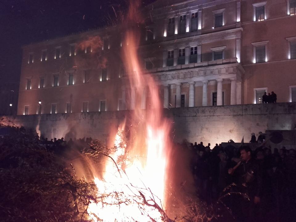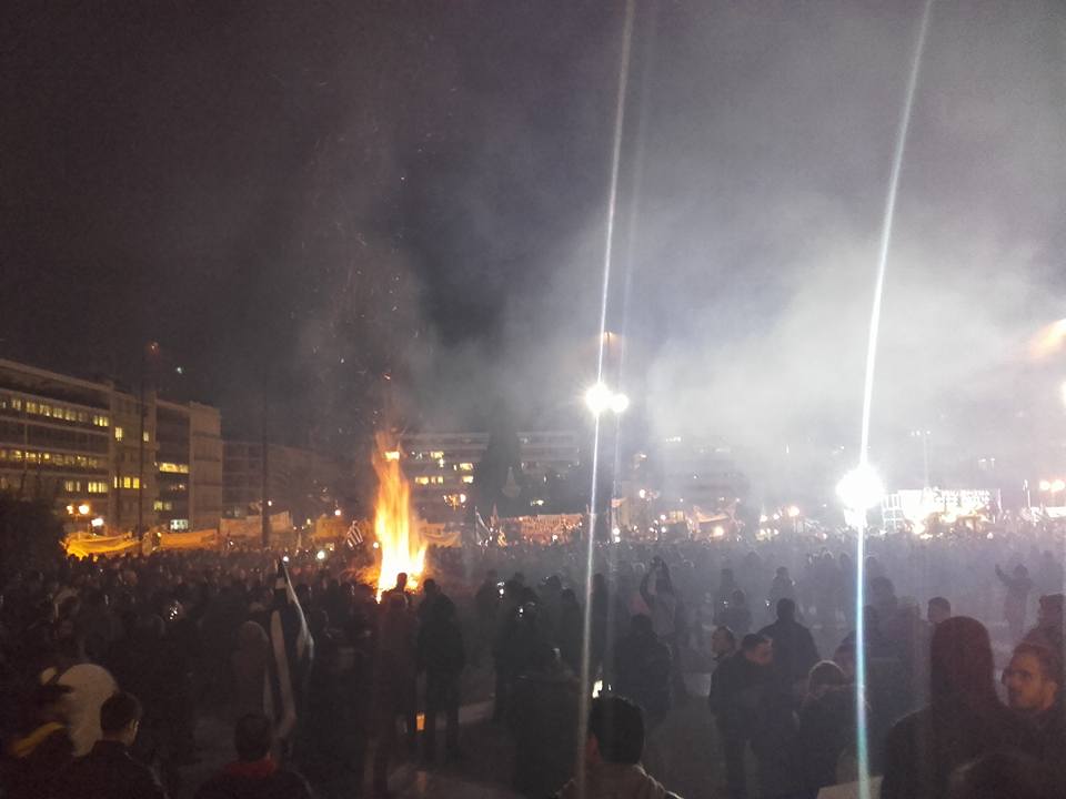 Έχει αποσυρθεί η φρουρά των Ευζώνων ενώ παρά τη βροχή ο κόσμος συνεχίζει να συρρέει. Ακούγονται τραγούδια από τα μεγάφωνα ενώ διακρίνεται μια εστία φωτιάς μπροστά από τη βουλή όπου αυτή την ώρα διαδηλώνουν αγρότες και άλλοι πολίτες κατά του ασφαλιστικού. Μέχρι τώρα το συλλαλητήριο εξελίσσεται ομαλά και καθόλα ειρηνικά.
