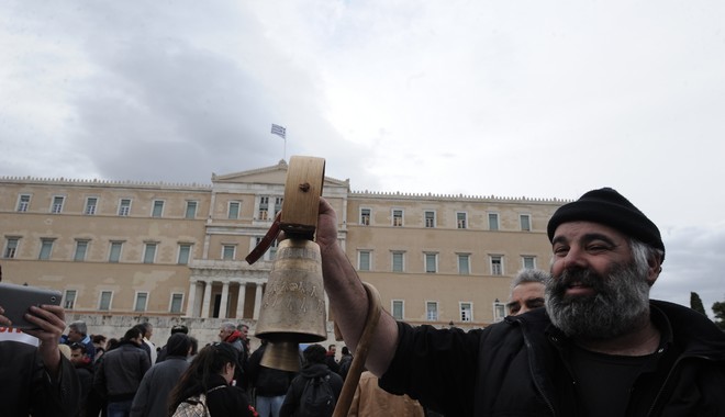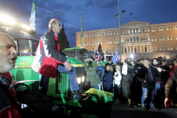Αγρότες από την Κρήτη, που από το πρωί έστησαν αντίσκηνα στην πλατεία Συντάγματος και δηλώνουν αποφασισμένοι να μείνουν εκεί, έφτασαν μπροστά στο μνημείο του Άγνωστου Στρατιώτη και αφού έψαλαν τον εθνικό ύμνο φώναζαν «κλέφτες».