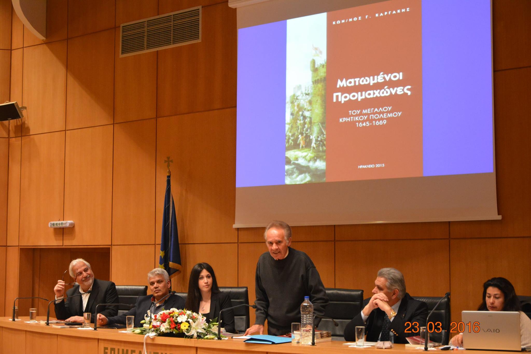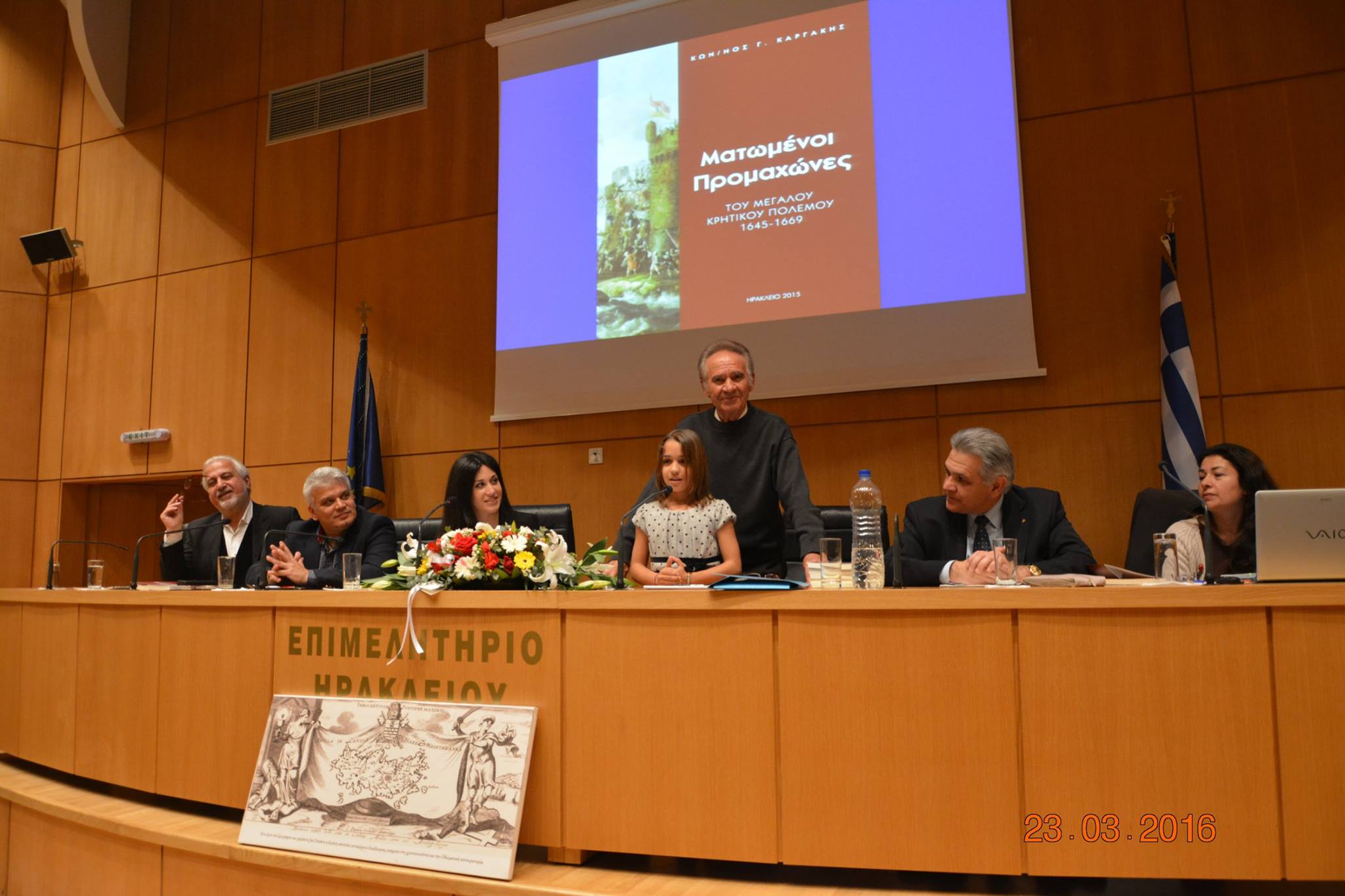 Με ιδιαίτερη επιτυχία και πλήθος κόσμου διεξήχθη χθες η παρουσίαση του λογοτεχνικού–ιστορικού έργου του συγγραφέα και εκπαιδευτικού Κωνσταντίνου Καργάκη, με τίτλο «Ματωμένοι Προμαχώνες του Μεγάλου Κρητικού Πολέμου, 1645–1669», στο Επιμελητήριο Ηρακλείου, από τις εκδόσεις Ίτανος και την ομώνυμη λέσχη ανάγνωσης Ίτανος, σε συνεργασία με τον Όμιλο Συγγραφέων–Λογοτεχνών Ηρακλείου (ΚΡΗΤΩΝ ΛΟΓΟΣ).
