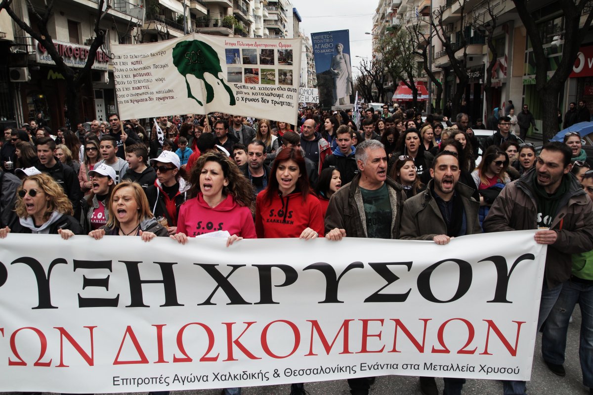 Χιλιάδες διαδηλωτές συγκντρώθηκαν σήμερα στην πλατεία ΧΑΝΘ απ’ όπου και ξεκίνησε μεγάλη πορεία ενάντια στην εξόρυξη χρυσού και την Ελληνικός χρυσός  στις Σκουριές. Οι διαδηλωτές, κινήθηκαν επί της Τσιμισκή, στη συνεχεία από τη Βενιζέλου στη Λεωφόρο Νίκης και κατέληξαν έξω από τον Λευκό Πύργο. Στην πορεία συμμετείχαν μελισσοκόμοι, κτηνοτρόφοι, αλιείς, εργαζόμενοι στον τουριστικό κλάδο και εργαζόμενοι και από άλλες παραγωγικούς τομείς οι οποίοι πλήττονται από την δραστηριότητα της Ελληνικός Χρυσός στην περιοχή των Σκουριών με αποτέλεσμα σε βάθος χρόνου την απωλεια θέσεων εργασίας.