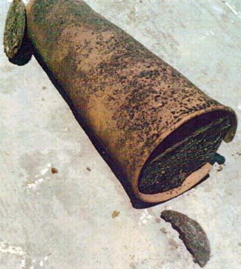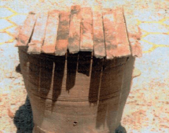 Πήλινο σκεύος καπνισμού των μελισσών. Από το μικρό αριστερό στόμιο φυσούσε ο μελισσοκόμος το προσάναμμα εντός, και ο καπνός έβγαινε από το πλατύ στόμιο δεξιά.
