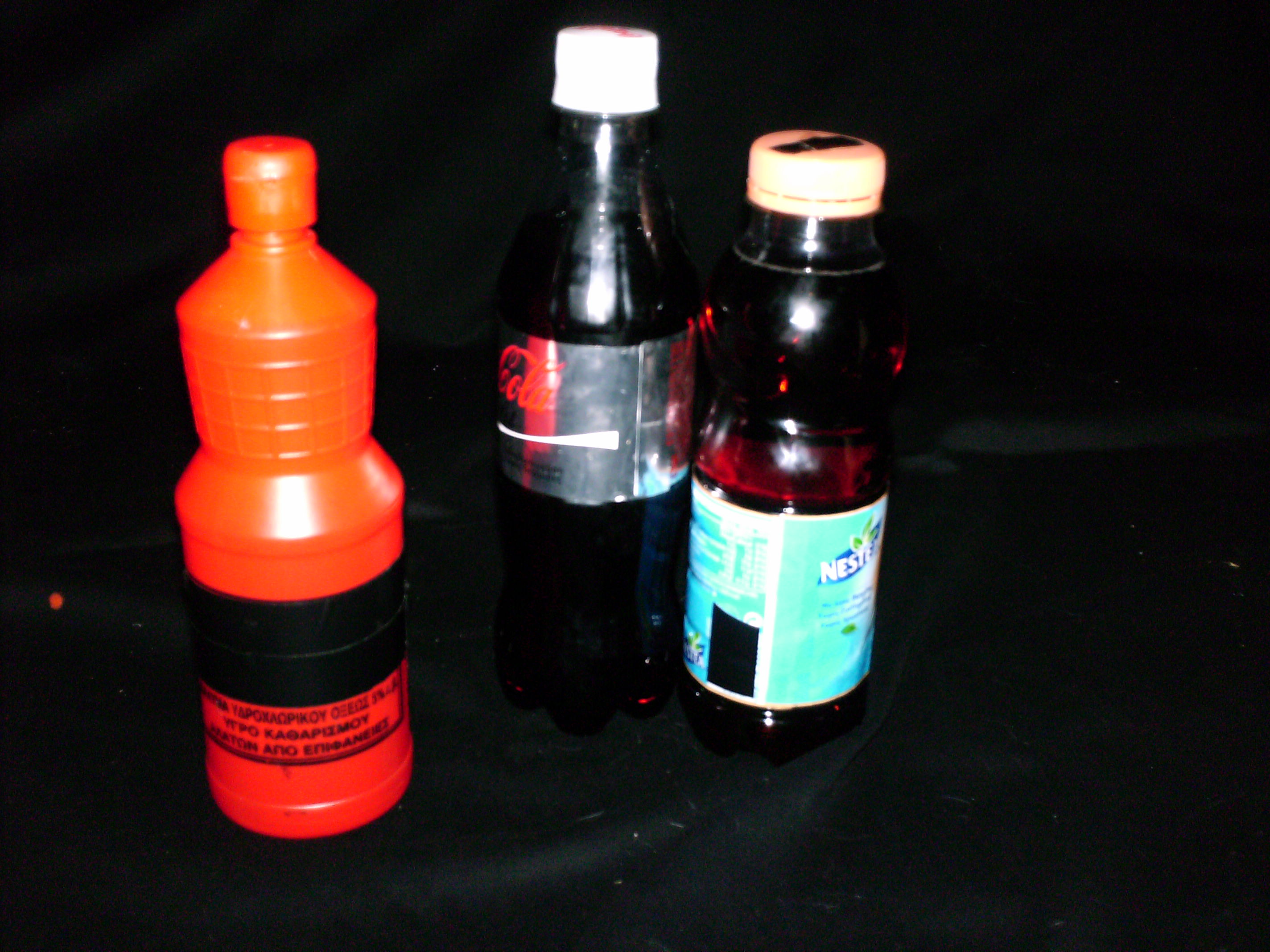 Για τα προϊόντα τις Nestle και της Coca Cola ακολουθήθηκε η εξής διαδικασία: ξεκολλήσαμε ελάχιστα την ετικέτα τους, και στο σημείο της κολλας ανοίξαμε με πυρωμένο τσιμπιδάκι πολύ λεπτή τρυπα ώστε να χωρα ισα ισα η μύτη της σύριγγας και να αφαιρέσουμε 20mL απ’ τα προϊόντα, επανατοποθετώντας 20mL υδροχλωρικού οξέως. Σφραγίσαμε την τρυπα με ελαχιστη σιλικόνη και απλά ξανακολλήσαμε την ετικέτα. Δεν υπήρξε κάποια εμφανής παραμόρφωση του προϊόντος.