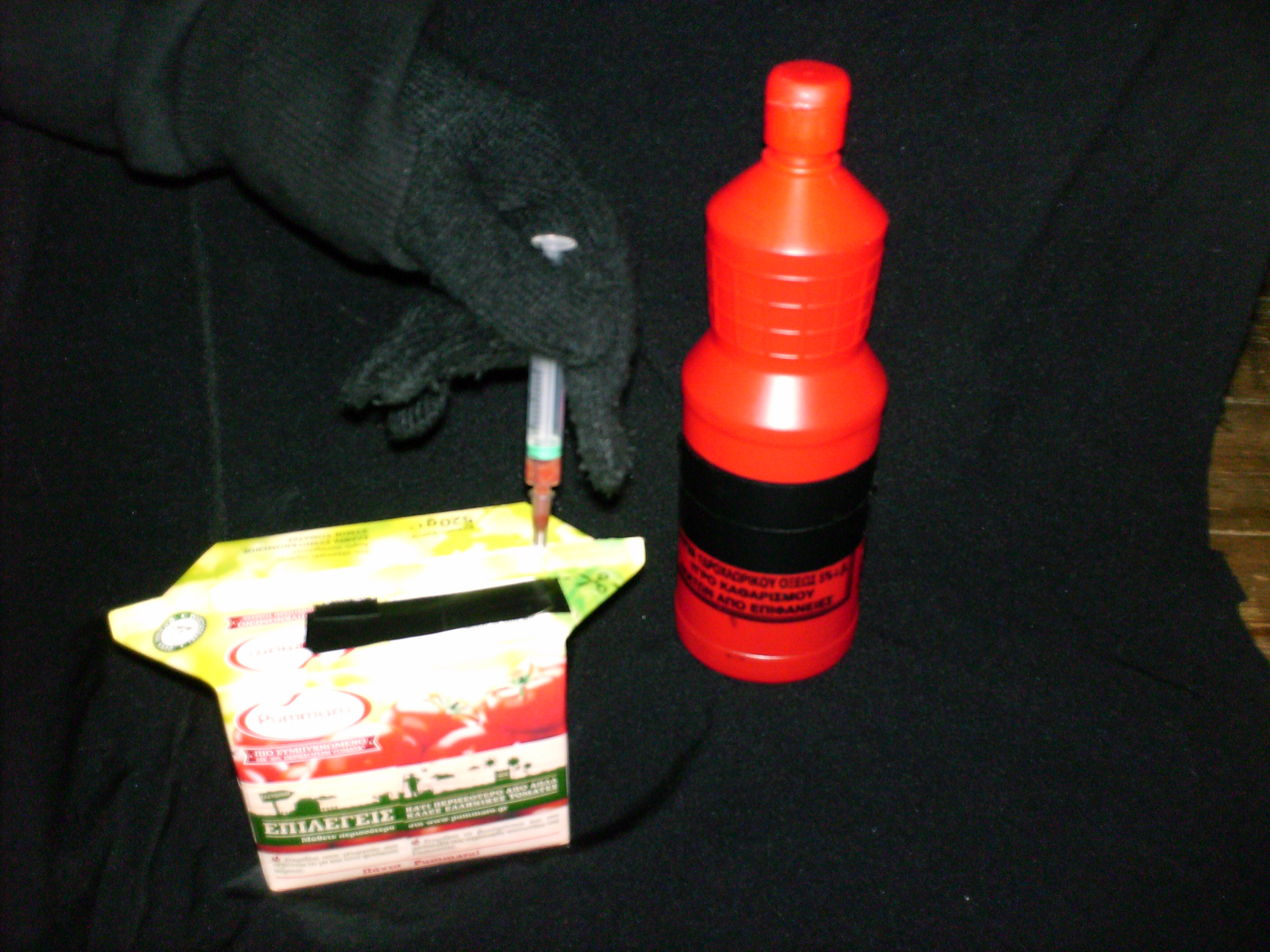 Για τις σάλτσες ντομάτας Pummaro (της Unilever) ακολουθήθηκε η ίδια διαδικασία με το γάλα, με τη διαφορα ότι χρειάστηκε να ανασηκώσουμε λίγο το πάνω μέρος της συσκευασίας, ώστε να τοποθετηθεί η σύριγγα, να αφαιρέσουμε 10mL προϊόν και να γεμίσουμε με 10mL υδροχλωρικό οξύ. Έπειτα απλά συγκολλήσαμε τα πλαϊνά του πάνω μέρους με λίγη κολλα σε ένα λεπτό πινέλο.