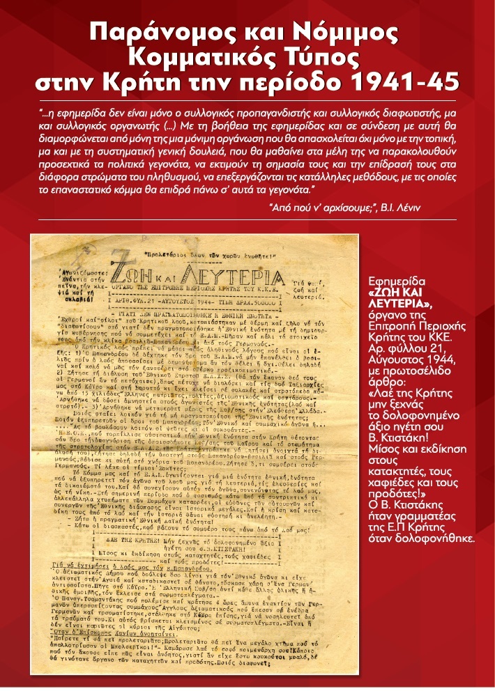 Να σημειωθεί, εξάλλου, ότι με αφορμή τις εκδηλώσεις αυτές, η ΕΠ Κρήτης του ΚΚΕ προχώρησε στην έκδοση ενός καλαίσθητου λευκώματος με ανέκδοτο αρχειακό υλικό. Σε αυτό, μεταξύ άλλων, περιέχονται φύλλα των εφημερίδων «ΖΩΗ ΚΑΙ ΛΕΥΤΕΡΙΑ», οργάνου της ΕΠ Κρήτης του ΚΚΕ, «ΦΩΝΗ ΤΗΣ ΠΑΤΡΙΔΟΣ», οργάνου της Παγκρήτιας Επιτροπής του ΕΑΜ, «ΛΕΥΤΕΡΑ ΝΙΑΤΑ», οργάνου του ΣΠ Κρήτης της ΕΠΟΝ, καθώς και άλλα παράνομα και νόμιμα Κομματικά, ΕΑΜικά και ΕΠΟΝίτικα έντυπα της Κρήτης της περιόδου 1941-1945.