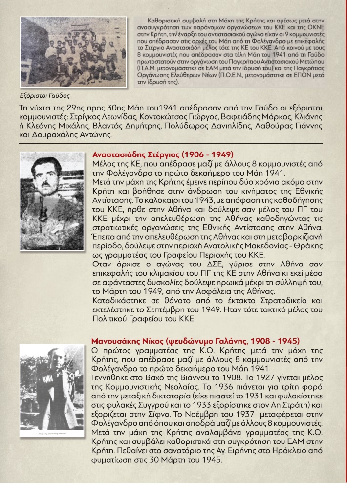 (…) Παράλληλα, κατά την ολοκλήρωση της κατάληψης της Κρήτης από τα ναζιστικά στρατεύματα, κατορθώνουν τη νύχτα της 29ης προς 30ής Μάη του 1941 να αποδράσουν από τη Γαύδο 8 εξόριστοι κομμουνιστές (…).