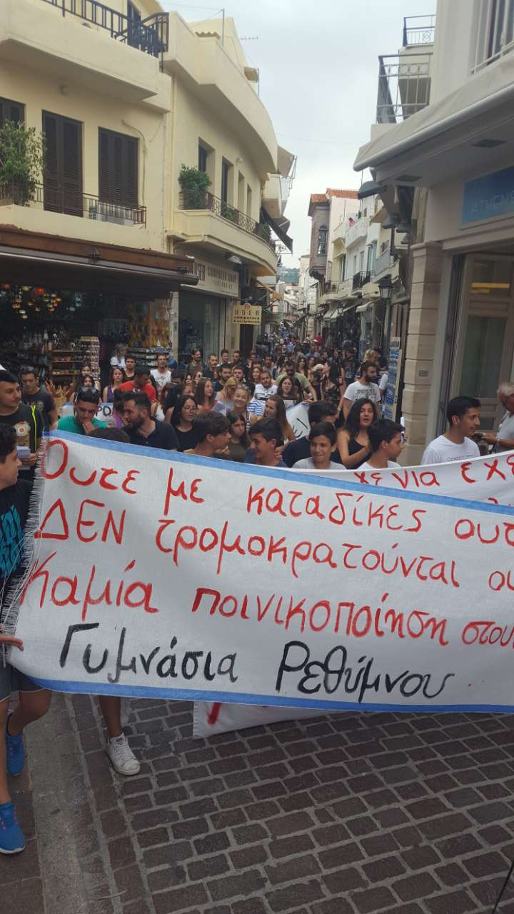 Συλλαλητήριο ενάντια στην ποινικοποίηση των μαθητικών κινητοποιήσεων και με αίτημα την ανάκληση της καταδικαστικής απόφασης κατά των τριών μαθητών στους οποίους επιβλήθηκε κοινωνική εργασία ογδόντα ωρών για τη συμμετοχή τους στις καταλήψεις του περασμένου Σεπτεμβρίου, πραγματοποίησαν σήμερα εκατοντάδες μαθητές και εκπαιδευτικοί στο Ρέθυμνο.