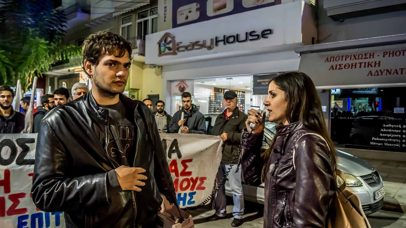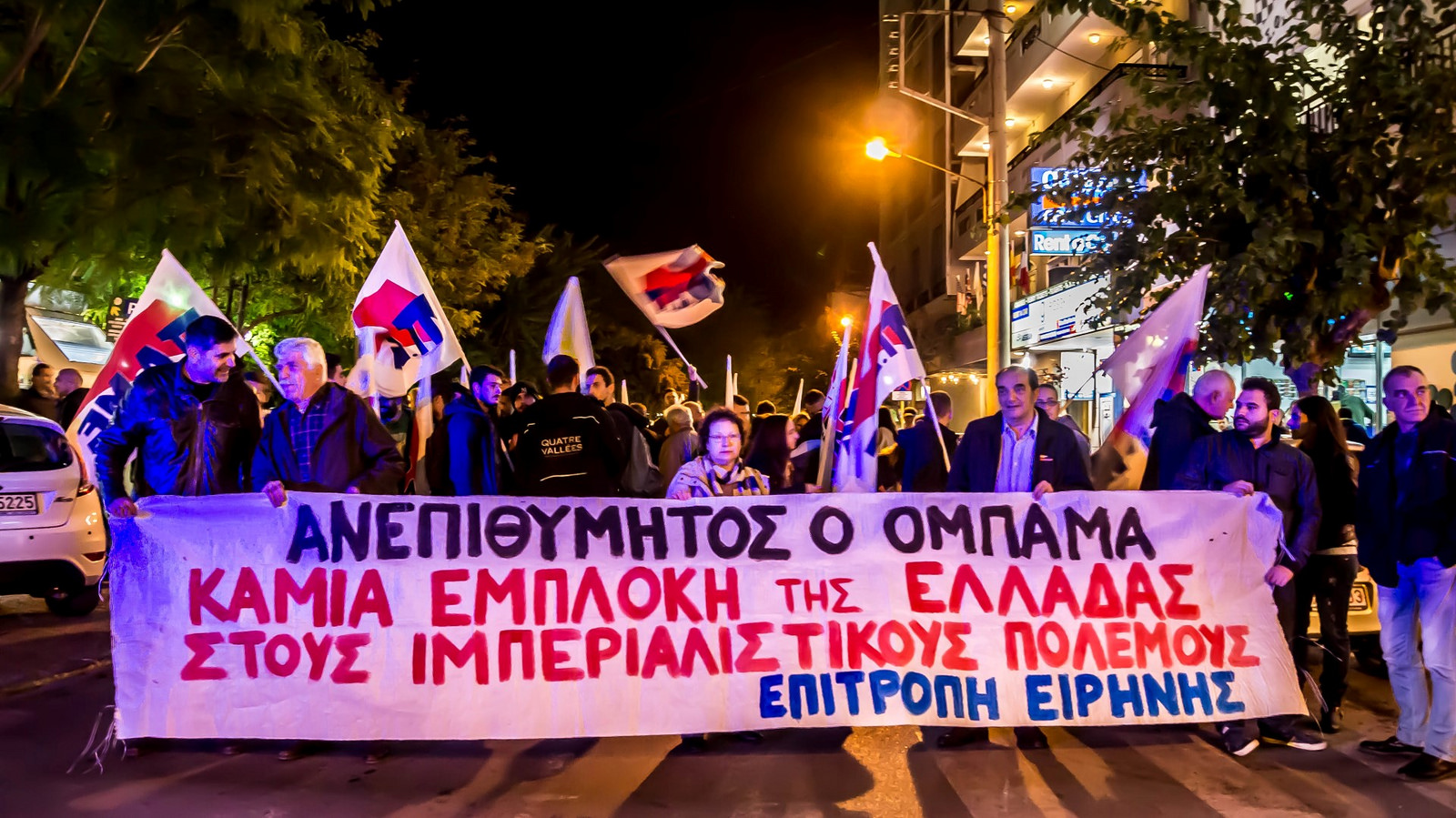 «Η Επιτροπή Ειρήνης Χανίων, οι Επιτροπές Ειρήνης Πανελλαδικά, η Ελληνική Επιτροπή για τη Διεθνή Ύφεση και Ειρήνη, το ΠΑΜΕ, Σωματεία και Φορείς του κινήματος, εργαζόμενοι, άνεργοι νέοι και συνταξιούχοι, υποδεχόμαστε σήμερα στη χώρα μας τον πρώην πρόεδρο των ΗΠΑ Μπαράκ Ομπάμα με το σύνθημα «Ανεπιθύμητος ο Ομπάμα στην Ελλάδα – Καμία εμπλοκή της Ελλάδας στους ιμπεριαλιστικούς σχεδιασμούς και πολέμους»
