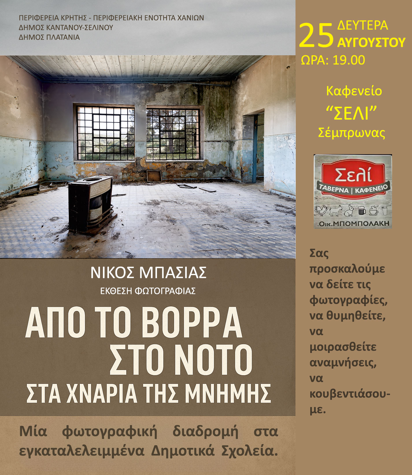 Στο επίκεντρο της εκδήλωσης βρίσκεται η φωτογραφική έκθεση του εικαστικού και φωτογράφου Νίκου Μπασιά, ο οποίος, με ευαισθησία και καλλιτεχνική ματιά, αναδεικνύει τα εγκαταλελειμμένα δημοτικά σχολεία της Ελλάδας, της Κύπρου και της Σμύρνης.