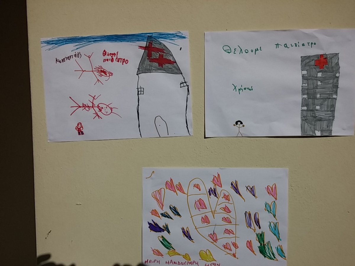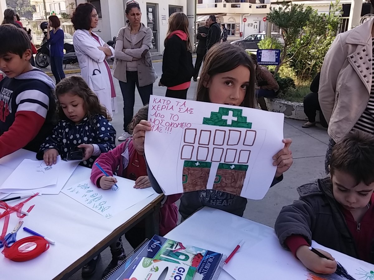 Σε σχετικό κείμενό της η Επιτροπή Γονέων ενημερώνει ότι παιδιά νηπιαγωγείων και τάξεων Δημοτικών μαζί με τους γονείς τους, μέλη των συλλόγων τριτέκνων και των Πολυτέκνων, των εργαζομένων του νοσοκομείου ετοίμασαν όμορφες ζωγραφιές για το νοσοκομείο τους το οποίο βρίσκεται σε άσχημη κατάσταση λόγω των περικοπών που έχουν επιβληθεί για να ικανοποιηθεί η τρόικα.