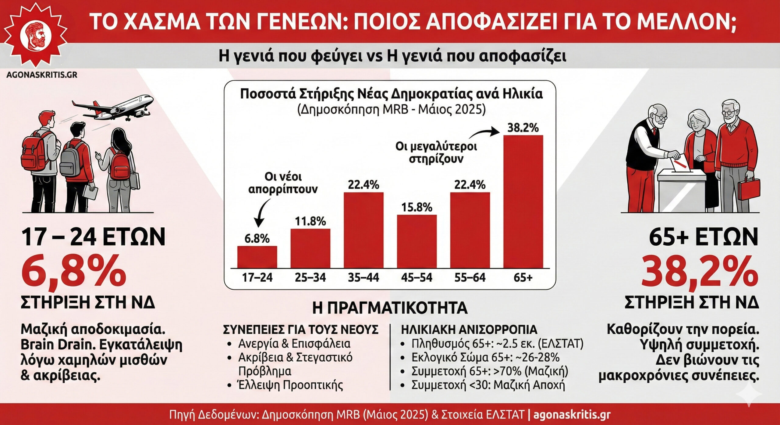 Την ώρα που δεκάδες χιλιάδες νέοι εγκαταλείπουν κάθε χρόνο την Ελλάδα αναζητώντας ένα καλύτερο μέλλον στο εξωτερικό, η πολιτική πορεία της χώρας καθορίζεται ολοένα και περισσότερο από τις ψήφους των μεγαλύτερων γενεών—εκείνων που δεν θα ζήσουν τις συνέπειες των αποφάσεών τους.
