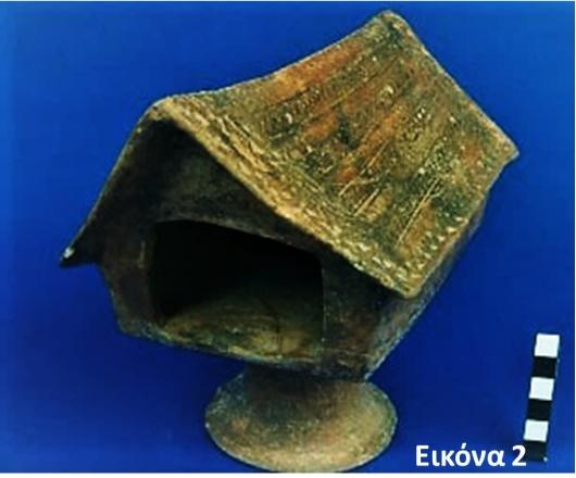 Εκτός από τα ευρήματα των μικρών ημισφαιρικών δοχείων με τα εγχάρακτα σύμβολα, ένα άλλο ενδιαφέρον αντικείμενο είναι η παρουσία του μοναδικού μοντέλου στέγασης οικίας. Το μοντέλο αυτό φέρει δίρριχτη στέγη, με κεραμίδια. Το εύρημα είναι εντυπωσιακό και δύσκολα ερμηνεύσιμο για την εποχή αυτή.