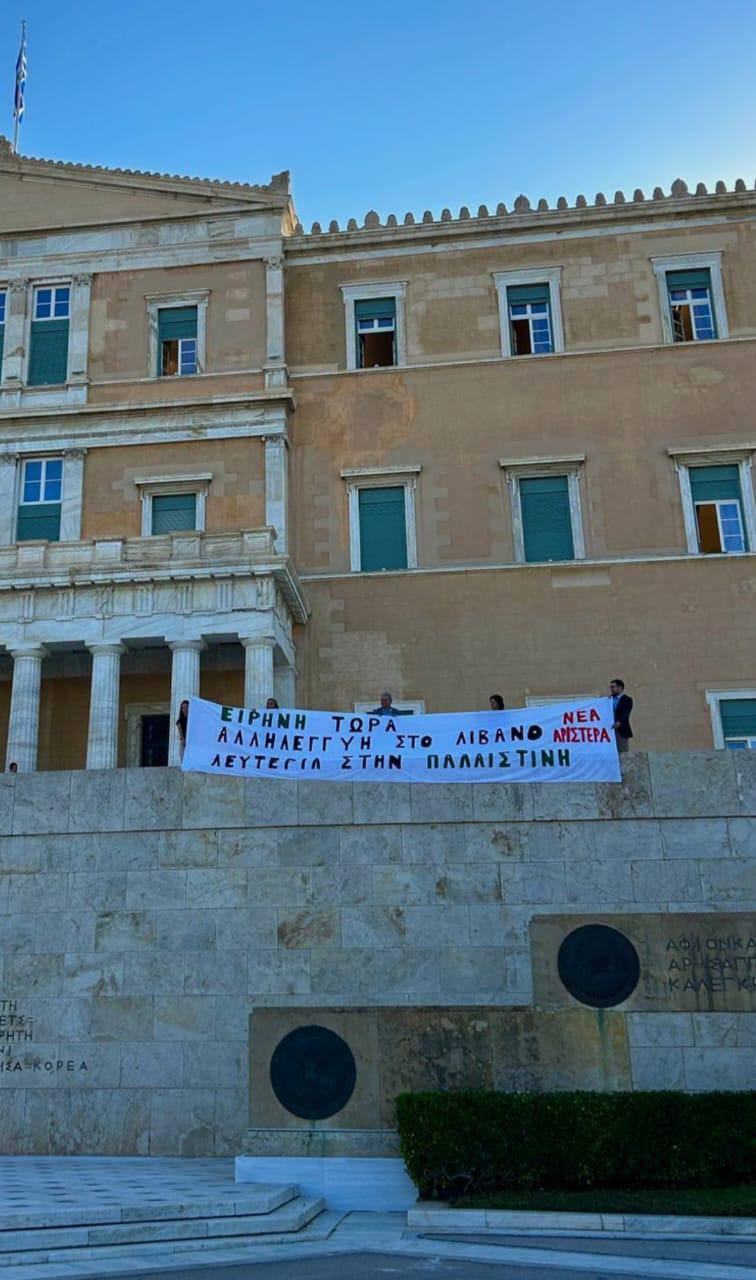 Έφη Αχτσιόγλου, Νάσος Ηλιόπουλος, Πέτη Πέρκα, Θεανώ Φωτίου, Χουσεΐν Ζεϊμπέκ, σήκωσαν πανό στο περιστύλιο της Βουλής που ανέγραφε: «Ειρήνη τώρα – Αλληλεγγύη στον Λίβανο – Λευτεριά στην Παλαιστίνη».