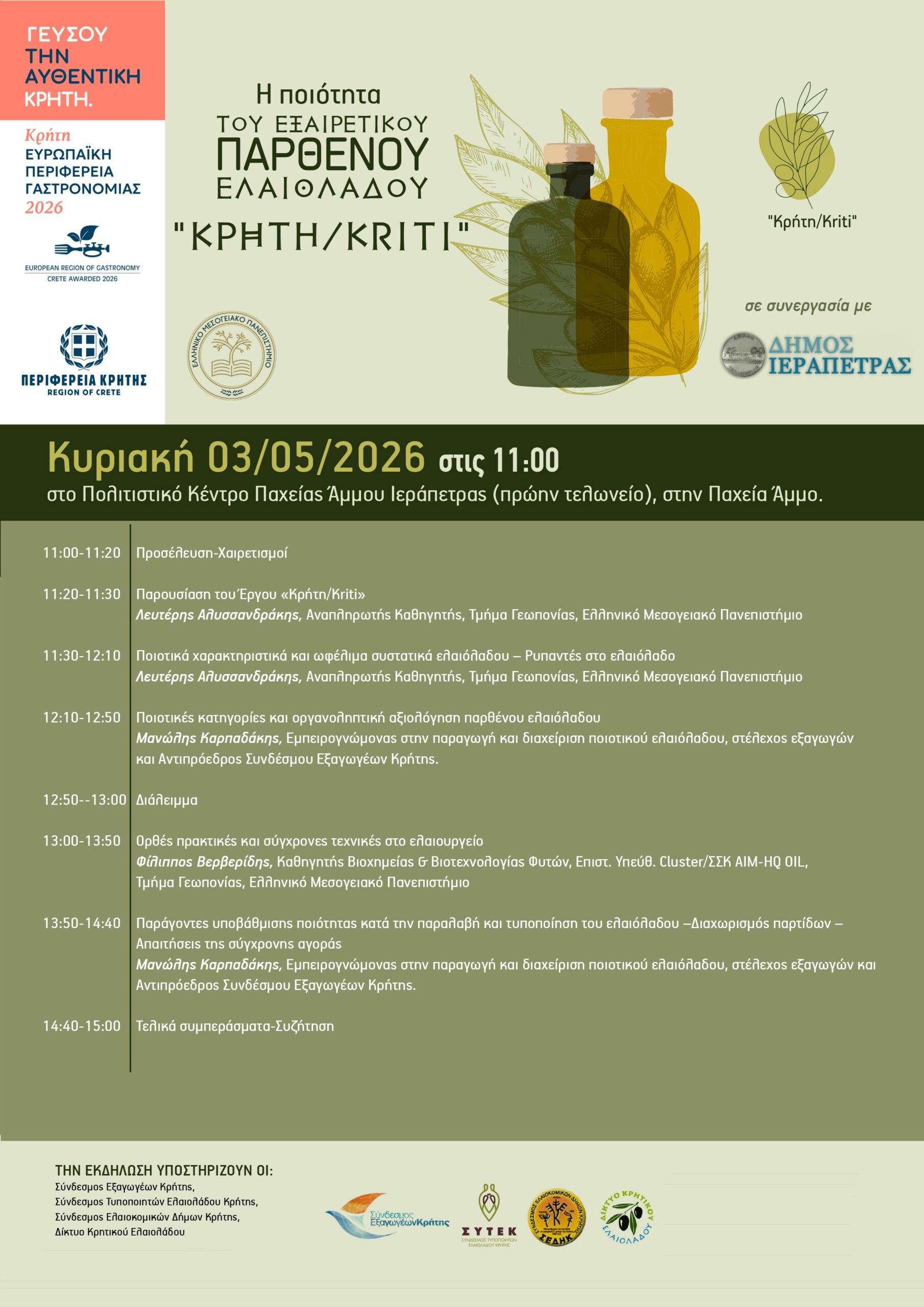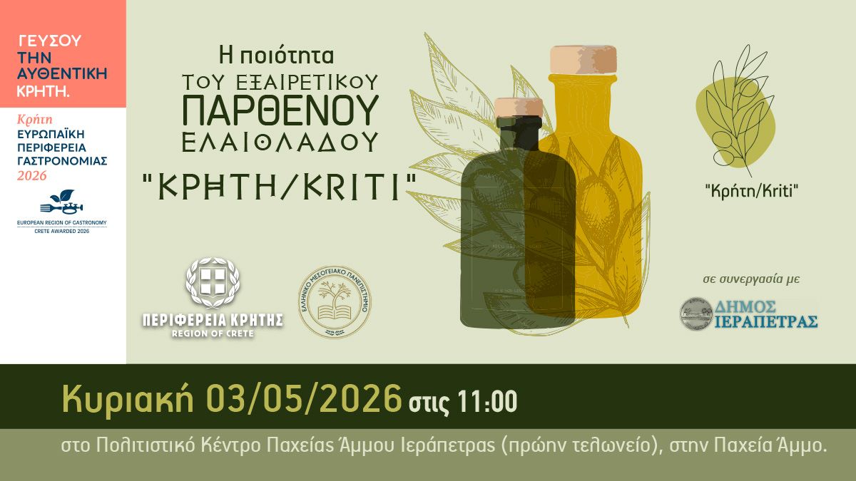 Η πρώτη από τις δύο νέες εκδηλώσεις θα πραγματοποιηθεί την Κυριακή 3 Μαΐου 2026, στις 11:00 π.μ., στο Πολιτιστικό Κέντρο Παχείας Άμμου Ιεράπετρας (πρώην Τελωνείο). Το θέμα της εκδήλωσης είναι «Η ποιότητα του εξαιρετικού παρθένου ελαιολάδου ΚΡΗΤΗ/KRITΙ, στο ελαιουργείο και την τυποποίηση».