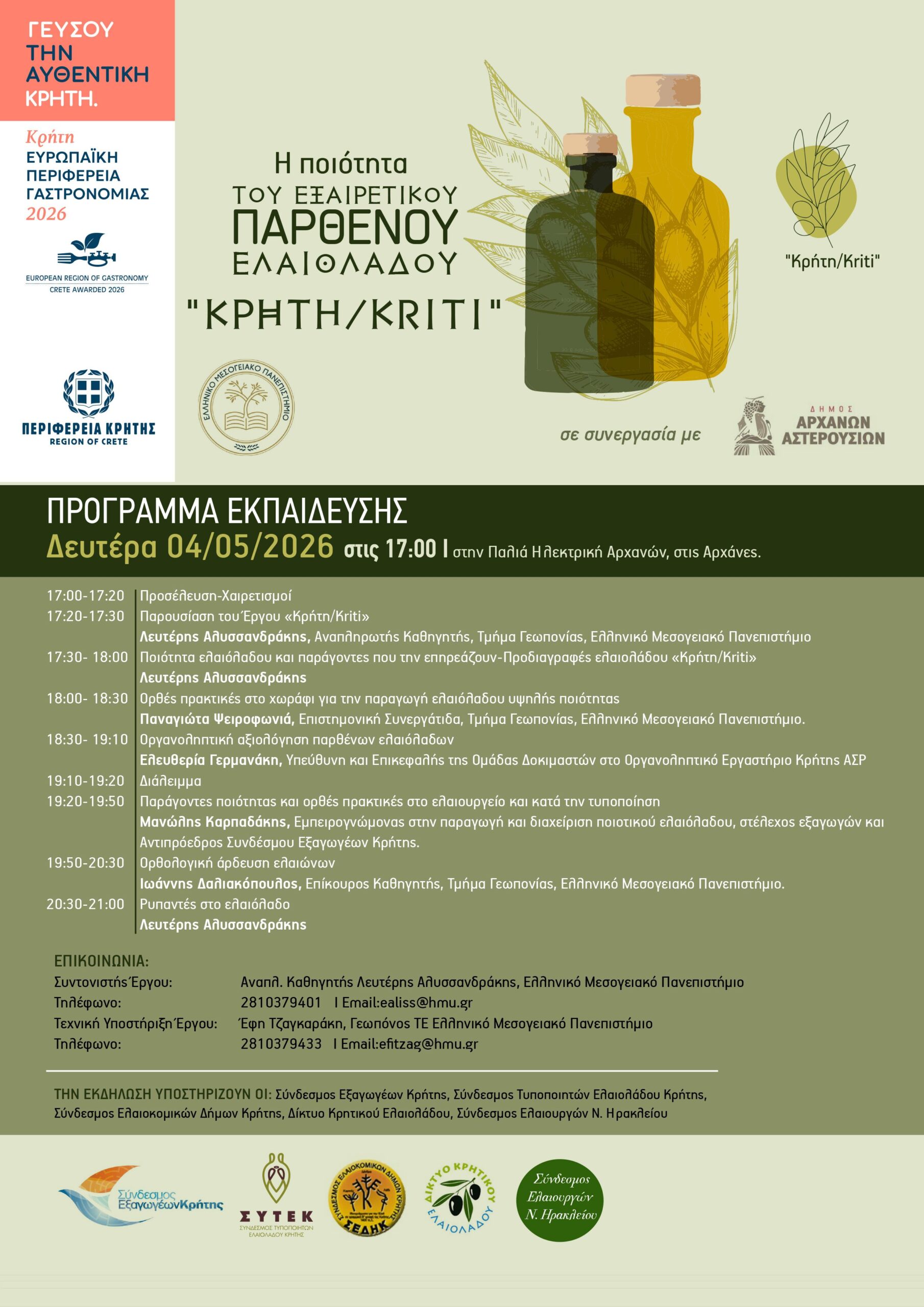 Η δεύτερη εκδήλωση είναι προγραμματισμένη για τη Δευτέρα 4 Μαΐου 2026, στις 17:00 μ.μ., στην Παλιά Ηλεκτρική στις Αρχάνες, στον Δήμο Αρχανών – Αστερουσίων, με θέμα «Η ποιότητα του εξαιρετικού παρθένου ελαιολάδου ΚΡΗΤΗ/KRITΙ».