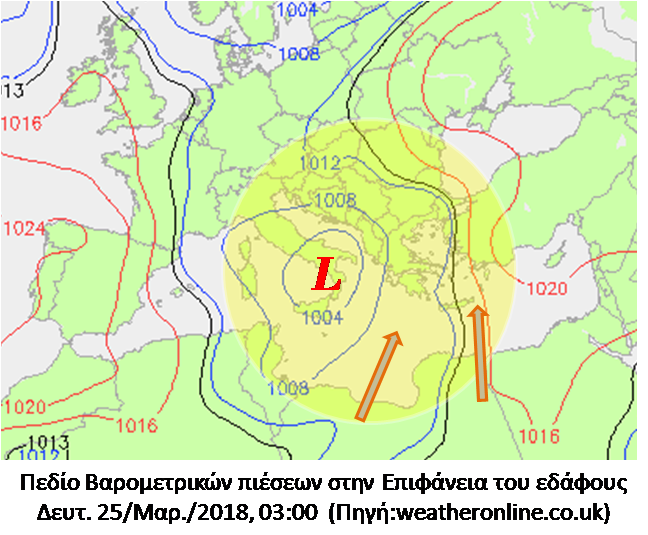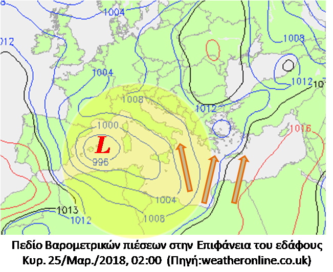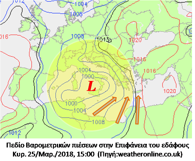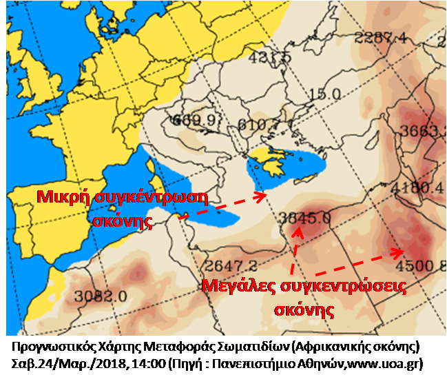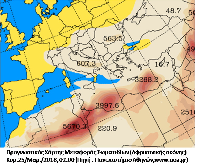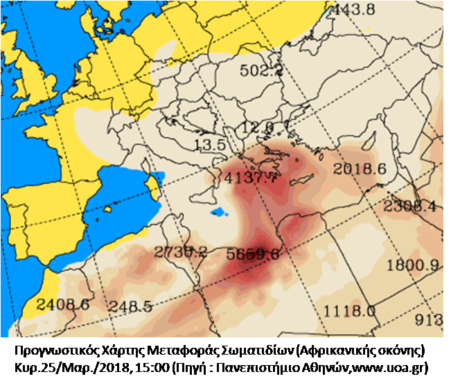 Πολύ έντονο φαίνεται να εξελίσσεται και πάλι το νέο κύμα μεταφοράς Αφρικανικής σκόνης για την Κρήτη από την Κυριακή 25 Μαρτίου. Θα πλήξει βέβαια και άλλες περιοχές του Ελλαδικού χώρου, ιδιαίτερα την Πελοπόννησο αλλά και την Αττική. Η μεταφορά αυτή οφείλεται στη μετακίνηση ενός νέου Βαρομετρικού χαμηλού από τα Δ – ΝΔ της χώρας, με κίνηση Βορειοανατολική  προς το Β. Ιόνιο, ενώ τροφοδοτείται από τις ακτές της Β. Αφρικής. Η κίνηση αυτή του Βαρομετρικού Χαμηλού (όπως εμφανίζεται στους διαδοχικούς χάρτες απεικόνισης των Βαρομετρικών συστημάτων) θα αποκαταστήσει και πάλι τους Νότιους ανέμους στο νησί μας , μία θερμότερη αέρια μάζα που έρχεται από τα νότια θα προκαλέσει αύξηση της θερμοκρασίας, ιδιαίτερα στα Βόρεια τμήματα της Κρήτης, ενώ το πλέον δυσμενές όλων είναι η έντονη μεταφορά σκόνης.