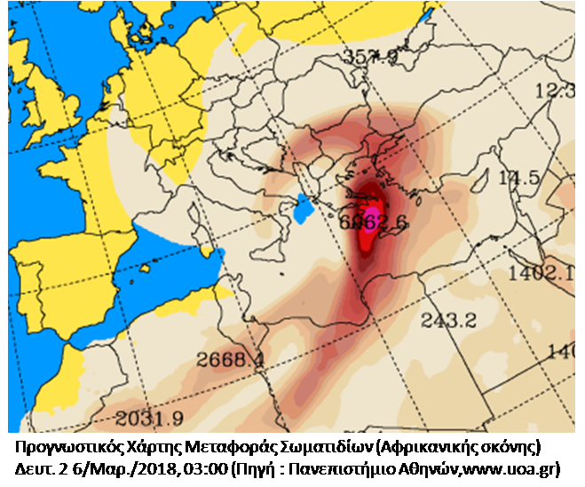 Η μεταφορά των σωματιδίων από τα νότια ξεκινάει μεν από το πρωί της Κυριακής αλλά οι συγκεντρώσεις είναι ανεχτές και δεν αναμένεται και πάλι να επηρεάσουν τις εορταστικές εκδηλώσεις. Αργότερα όμως (όπως φαίνεται και από τους προγνωστικούς χάρτες μεταφοράς σωματιδίων – Αφρικανικής σκόνης) του Πανεπιστημίου Αθηνών (οι συγκεντρώσεις είναι σε : mgr/m² ) θα υπάρξει μία πιο έντονη μεταφορά προκαλώντας και πάλι προβλήματα στο νησί μας, καθότι θα υπάρχει σημαντική θολότητα στην ατμόσφαιρα ενώ θα περιορίζεται σημαντικά και η οριζόντια ορατότητα, επιπλέον προσοχή χρειάζεται όμως και από τον καθένα μας. Δυστυχώς στην κατάσταση αυτή συγκλίνουν όλα τα προγνωστικά μοντέλα μεταφοράς σωματιδίων. Οι μέγιστες συγκεντρώσεις εμφανίζονται τις νυκτερινές ώρες της Κυριακής – ξημερώματα Δευτέρας και σε κάθε περίπτωση απαιτεί μέγιστη προσοχή. Η υποχώρηση των συγκεντρώσεων σκόνης θα ξεκινήσει σταδιακά από τη Δευτέρα το απόγευμα, διατηρώντας όμως ακόμη σημαντικές ποσότητες , ενώ αποκατάσταση μιας πιο καθαρής ατμόσφαιρας αναμένεται από την Τρίτη και μετέπειτα.