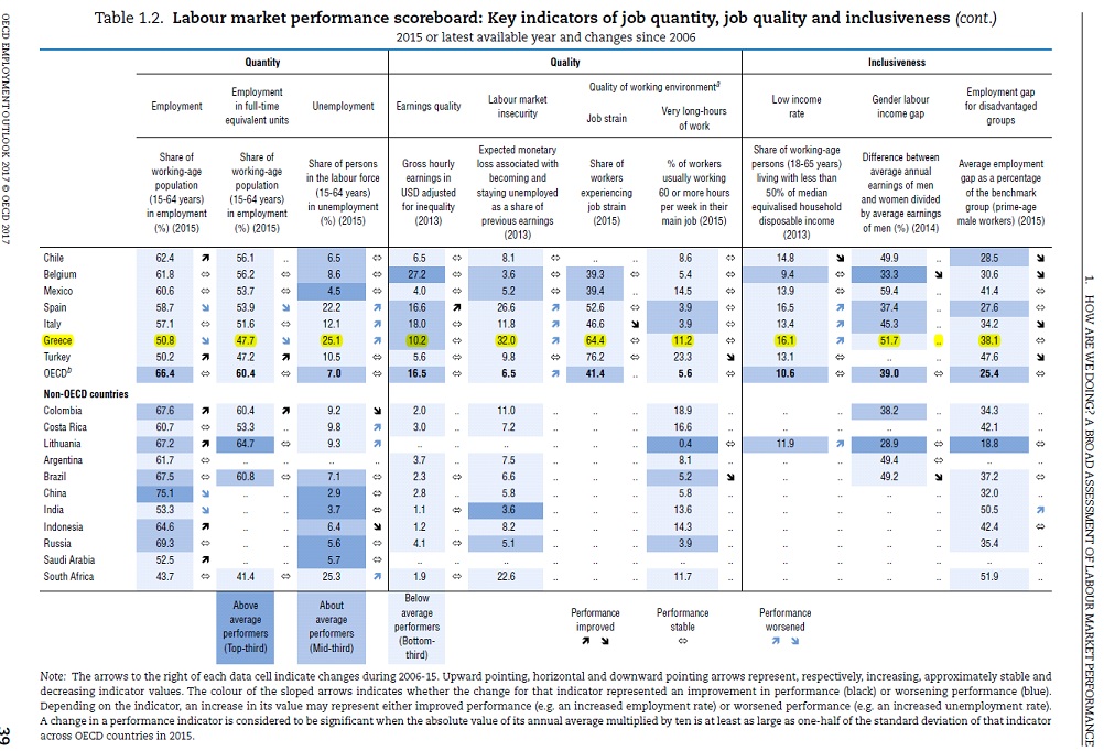 Την εικόνα αυτή επιβεβαιώνει η πρόσφατη έκθεσή του ΟΟΣΑ για την Απασχόληση όπου διαπιστώνει ότι η Ελλάδα βρίσκεται κάτω από τον Μέσο Όρο των χωρών του ΟΟΣΑ σε 9 δείκτες για την απόδοση της αγοράς εργασίας και συγκεκριμένα, στους δείκτες της ανεργίας, της απασχόλησης σε θέσεις πλήρους απασχόλησης, στην εργασιακή ασφάλεια, στο εργασιακό άγχος και στο ποσοστό εργαζομένων που αναγκάζεται να επιβιώσει με πολύ χαμηλά εισοδήματα.