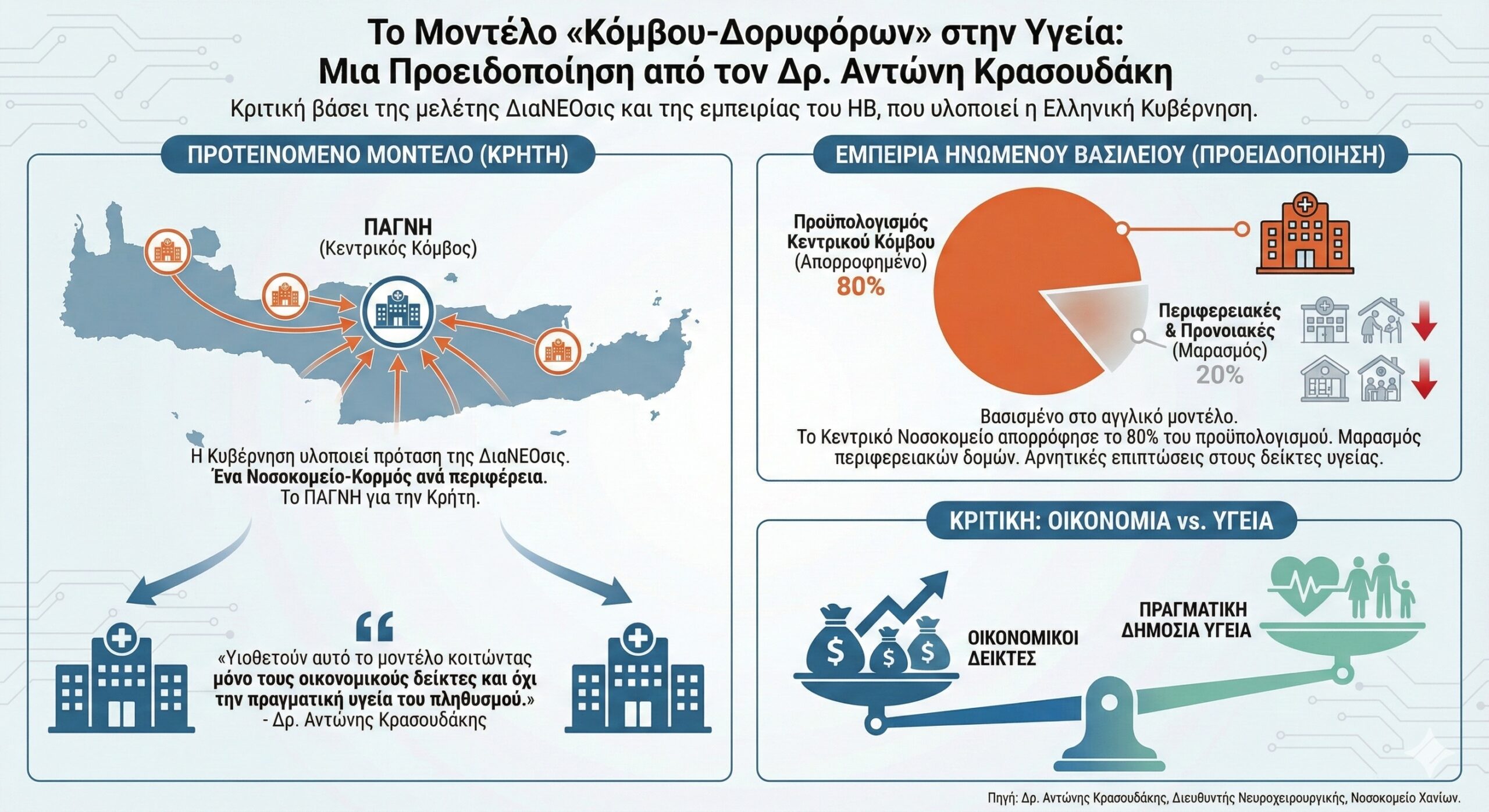 Ο Διευθυντής της Νευροχειρουργικής Κλινικής συνδέει τις εξελίξεις στην Ελλάδα με συγκεκριμένες μελέτες και πρότυπα που έχουν αποτύχει στο εξωτερικό. Αναφέρεται στη μελέτη της «ΔιαΝΕΟσις», υποστηρίζοντας ότι η κυβέρνηση υλοποιεί πολλές από τις προτάσεις της, οι οποίες προωθούν τη συγκέντρωση των υπηρεσιών.