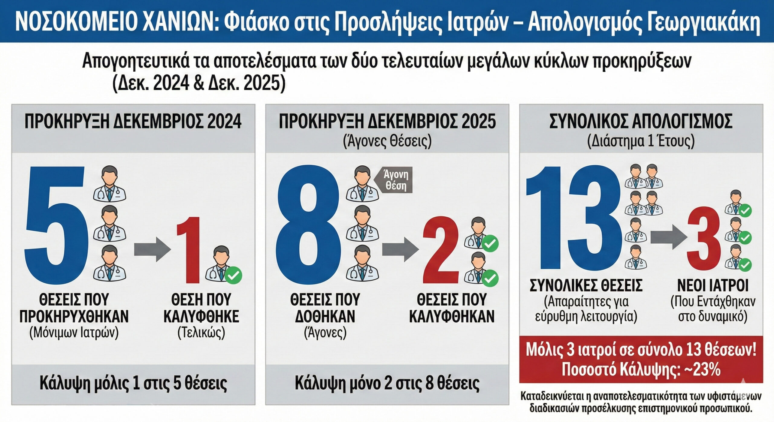 Τον Δεκέμβριο του 2024, από τις πέντε (5) θέσεις μόνιμων ιατρών που είχαν προκηρυχθεί για το Νοσοκομείο Χανίων, τελικώς καλύφθηκε μόλις μία (1).
