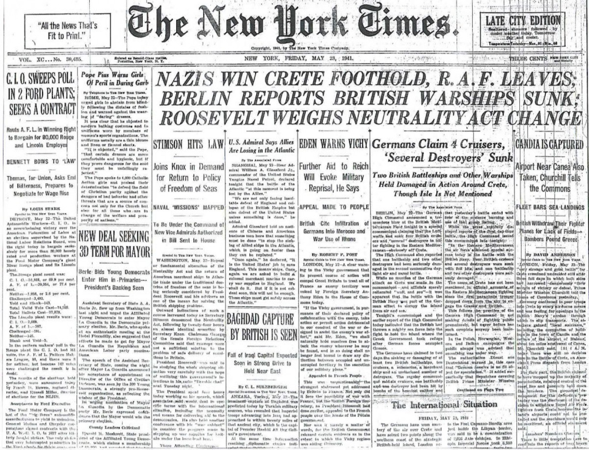 “Η πολύ περίεργη και άγρια μάχη για την Κρήτη”: Το πρωτοσέλιδο των New York Times για τη Μάχη της Κρήτης στις 23 Μαϊου 1941 – Τι έλεγε το τηλεγράφημα στον πρόεδρο Ρούσβελτ – Τι δήλωσε ο Τσώρτσιλ | Σπάνια ντοκουμέντα