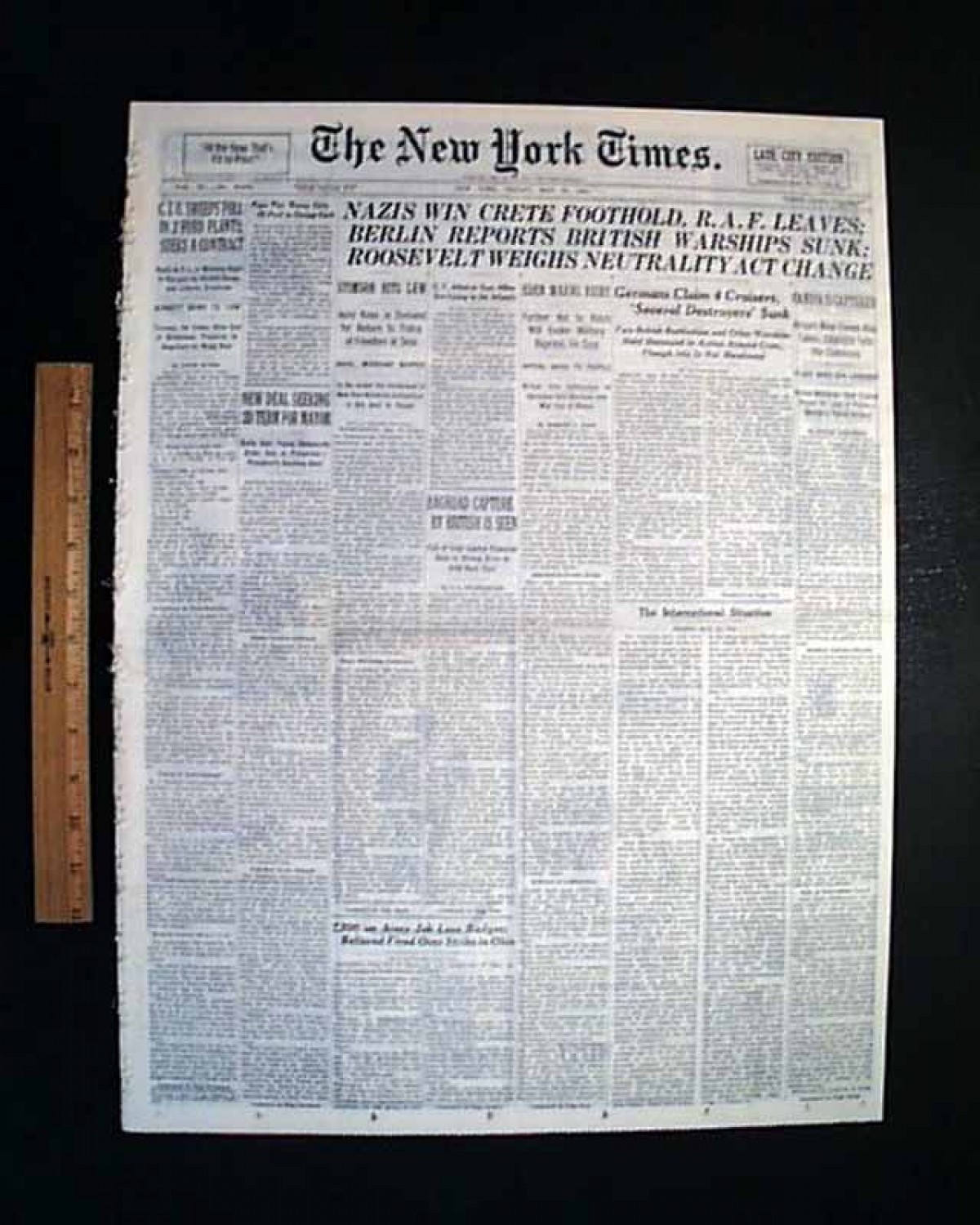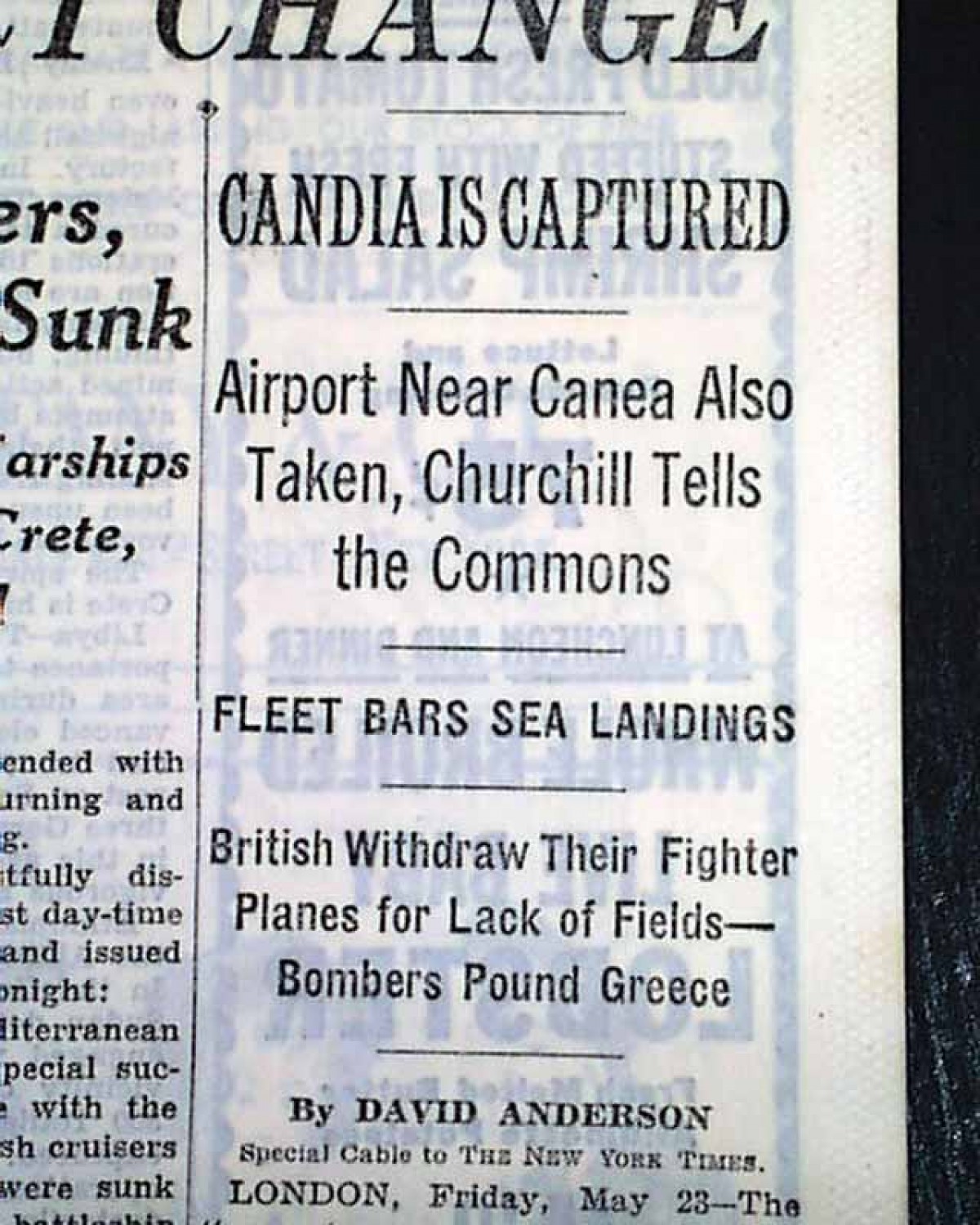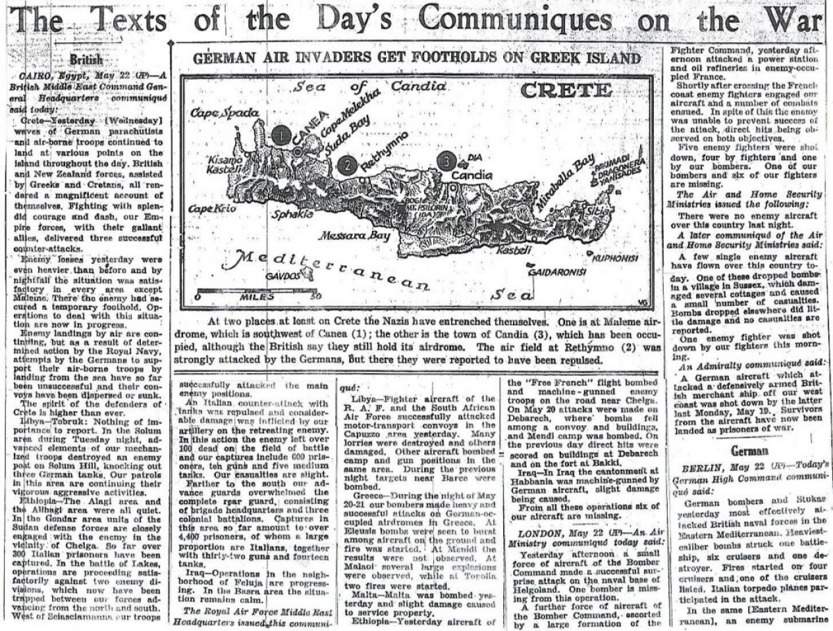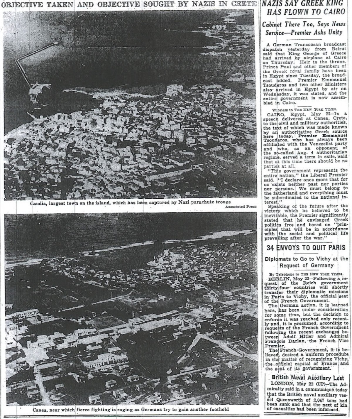Και η New York Times, με πρωτοσέλιδο δημοσίευμα στις 23 Μαϊου 1941 και πολυσέλιδο ρεπορτάζ και αναλύσεις, αναφέρονται διεξοδικά στις εξελίξεις της Μάχης που δόθηκε στην Κρήτη.