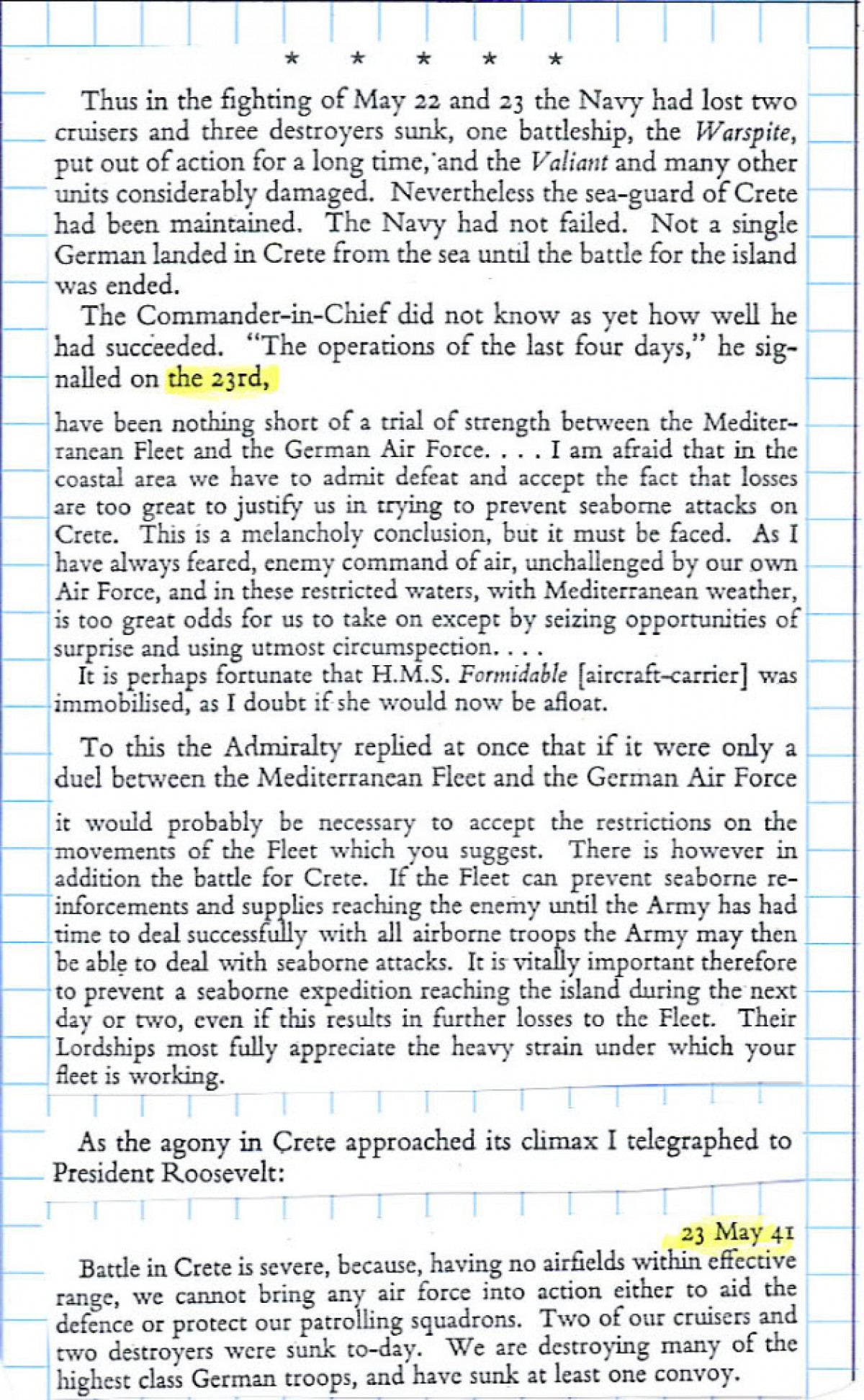 “Η Μάχη της Κρήτης είναι άγρια, γιατί, δίχως να έχουμε αεροδρόμια σε κοντινή απόσταση, δε μπορούμε να φέρουμε αεροπορικές δυνάμεις στη σύγκρουση, είτε για να βοηθήσουμε την άμυνα ή για να προστατέψουμε τις μονάδες μας. Σήμερα 4 πλοία μας καταστράφηκαν. Όμως, έχουμε κι εμείς καταστρέψει πολλές ελίτ μονάδες των ναζί και έχουμε βουλιάξει ένα μεταφορικό”.