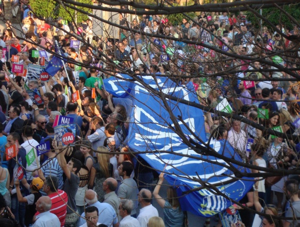 Στις 2/7, στην πλατεία Αγίας Σοφίας στη Θεσσαλονίκη, ομάδα συντρόφων/ισσων πραγματοποιήσαμε παρέμβαση στην φιέστα “ΜΕΝΟΥΜΕ ΕΥΡΩΠΗ”. Παρεισφρήσαμε στην συγκέντρωση τους με την ανάλογη γιάπικη αμφίεση και με περίσσιο δόλο “προτρέψαμε” τους παρευρισκόμενους να κρατήσουνε πάνω από τα κεφάλια τους, πανό 10 μέτρων που έγραφε: ΜΕΝΟΥΜΕ ΣΚΛΑΒΟΙ (με μια ευρωπαική και μια ελληνική σημαία να καίγονται βλ. φωτο)