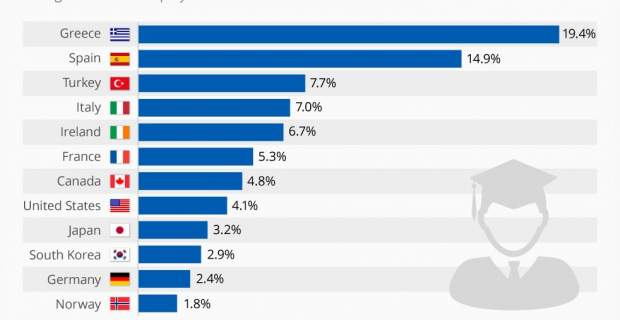 Σημειώνεται πως σε παλαιότερη έκθεση του ΟΟΣΑ, η Ελλάδα αναδεικνυόταν σε παγκόσμια πρωταθλήτρια στους άνεργους πτυχιούχους. Στην εν λόγω έκθεση, που αφορούσε την ανεργία παγκοσμίως, ο ΟΟΣΑ επισήμανε πως η ανεργία των πτυχιούχων Ελλήνων επιστημόνων που εγκαταλείπουν την χώρα αναζητώντας μία ευκαιρία στο εξωτερικό, αποτελεί ίσως το βαθύτερο τραύμα της οικονομικής κρίσης. Το ποσοστό των Ελλήνων ανέργων πτυχιούχων ανέρχεται στο 19,4%, δηλαδή 1 στους 5 Έλληνες επιστήμονες είναι χωρίς δουλειά.