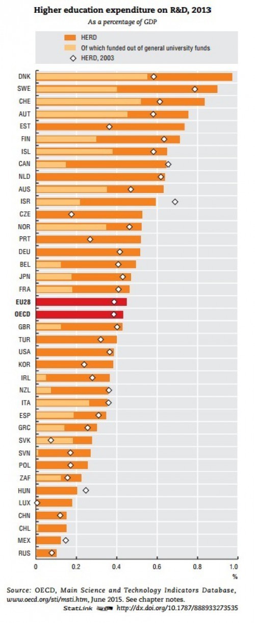 To 2013 η Ελλάδα δαπάνησε μόνο το 0,08% του ΑΕΠ της στην έρευνα, ποσοστό που την κατατάσσει στις πιο χαμηλές θέσεις μεταξύ των ανεπτυγμένων χωρών.