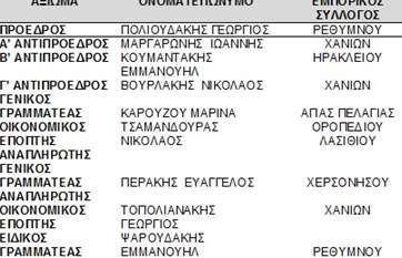 H σύνθεση του Νέου Διοικητικού Συμβουλίου της Ομοσπονδίας Εμπορικών Συλλόγων Κρήτης, που προέκυψε μετά από μυστική ψηφοφoρία και με απόλυτη πλειοψηφία,  είναι: