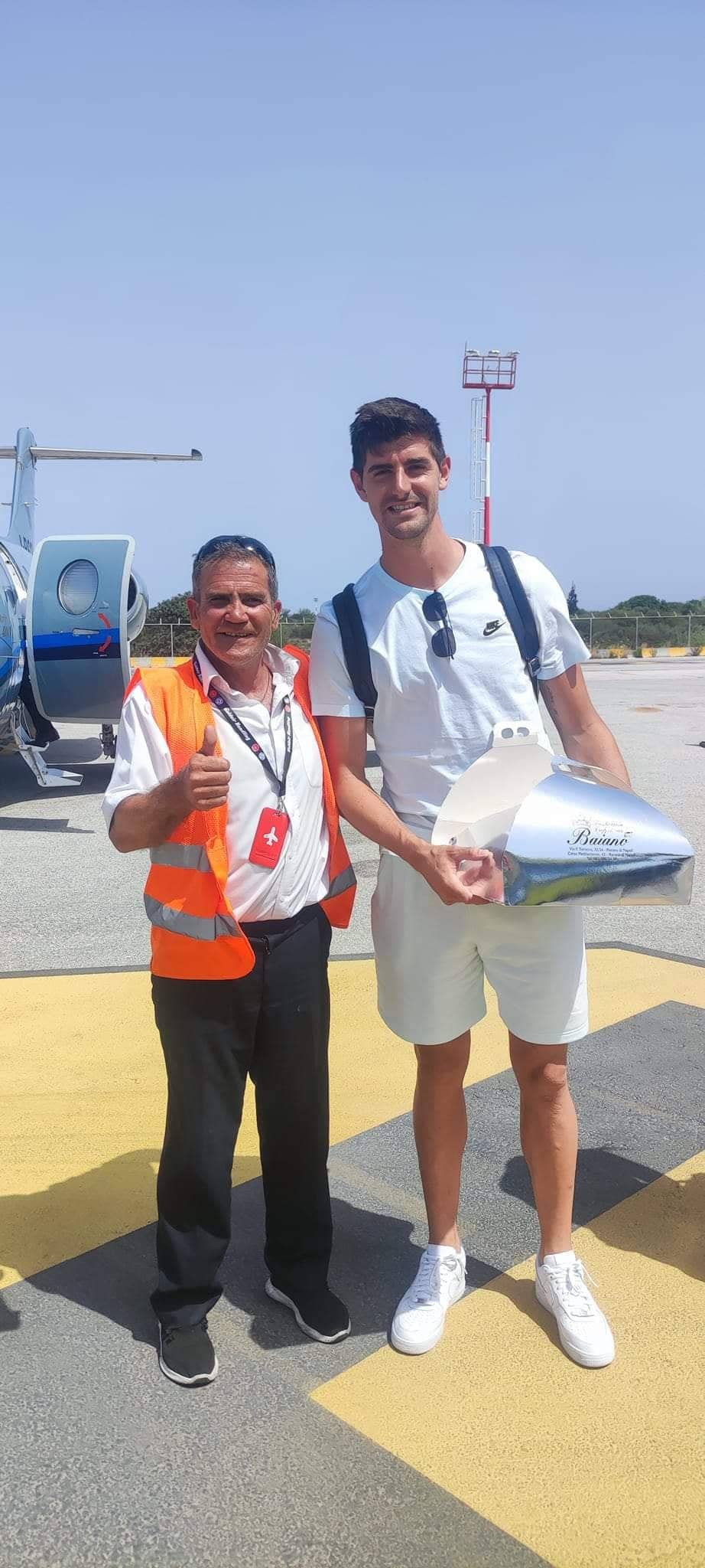 Χαμογελαστός και φιλικός ο Τιμπό Κουρτουά δέχτηκε με χαρά να φωτογραφηθεί με τον παλαίμαχο ποδοσφαιριστή της Ιωνίας Χανίων, Γιώργο Στυλιανουδάκη, ο οποίος τον συνεχάρη για την εμφάνιση του στον τελικό του champions League.